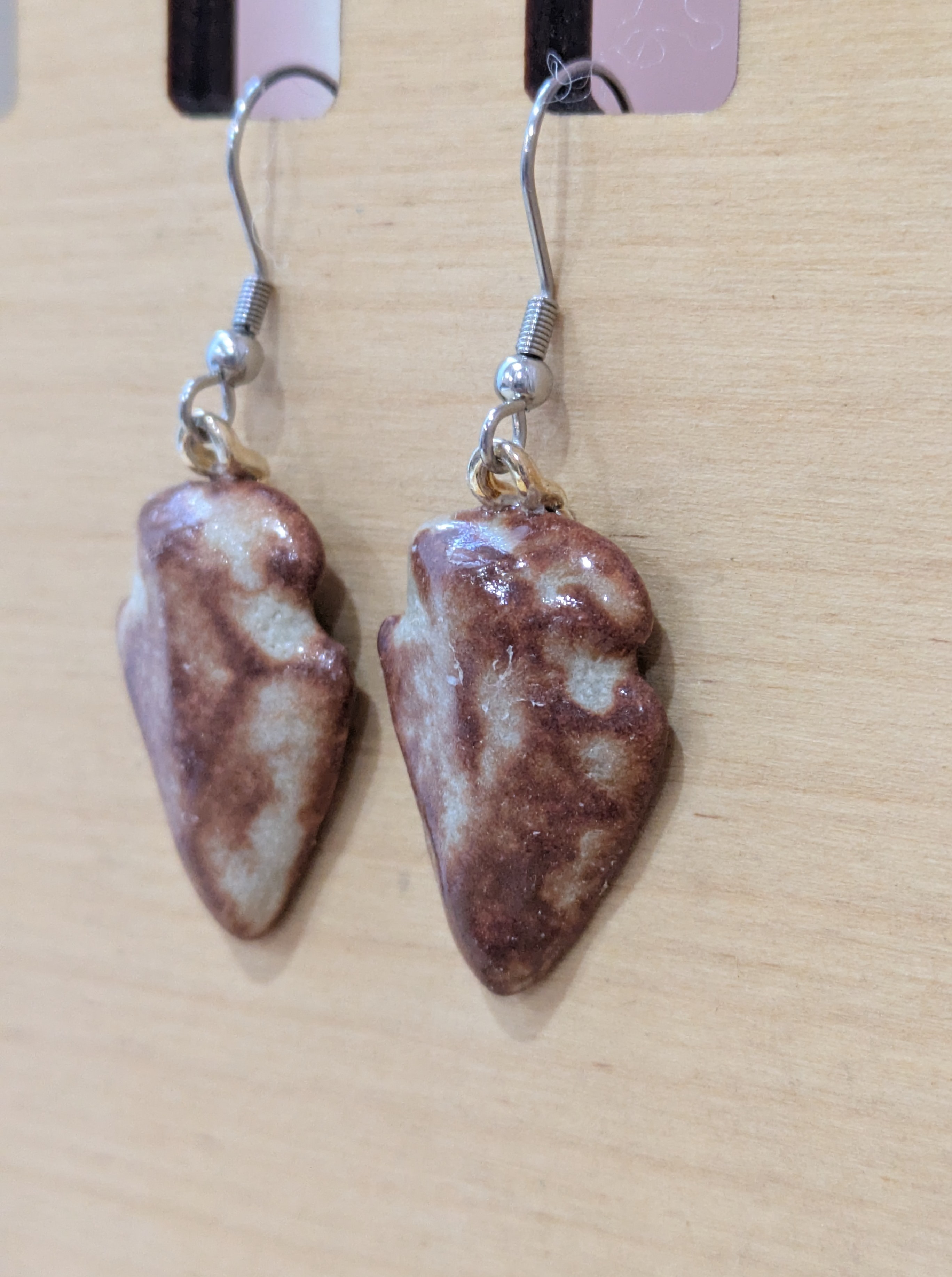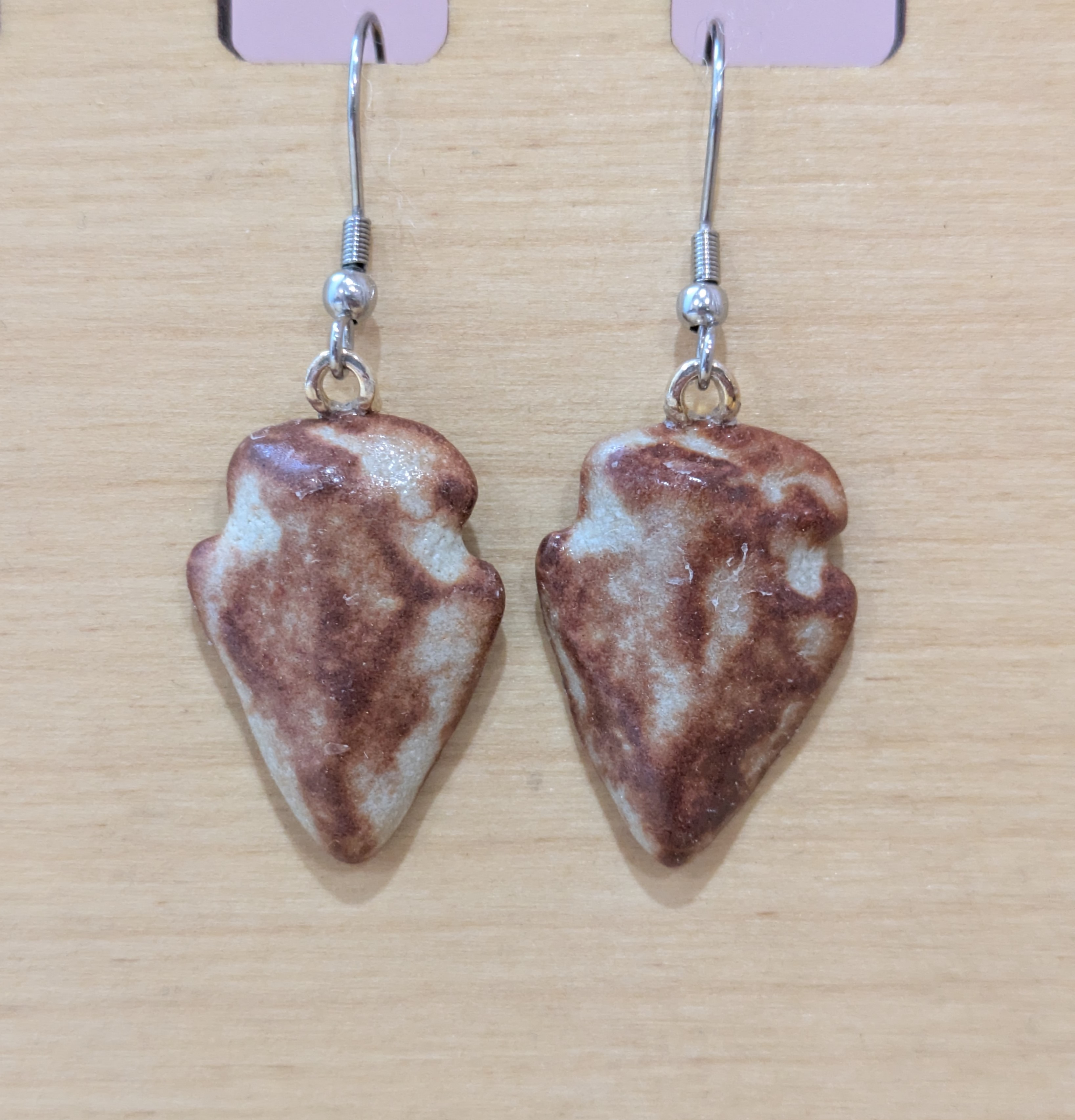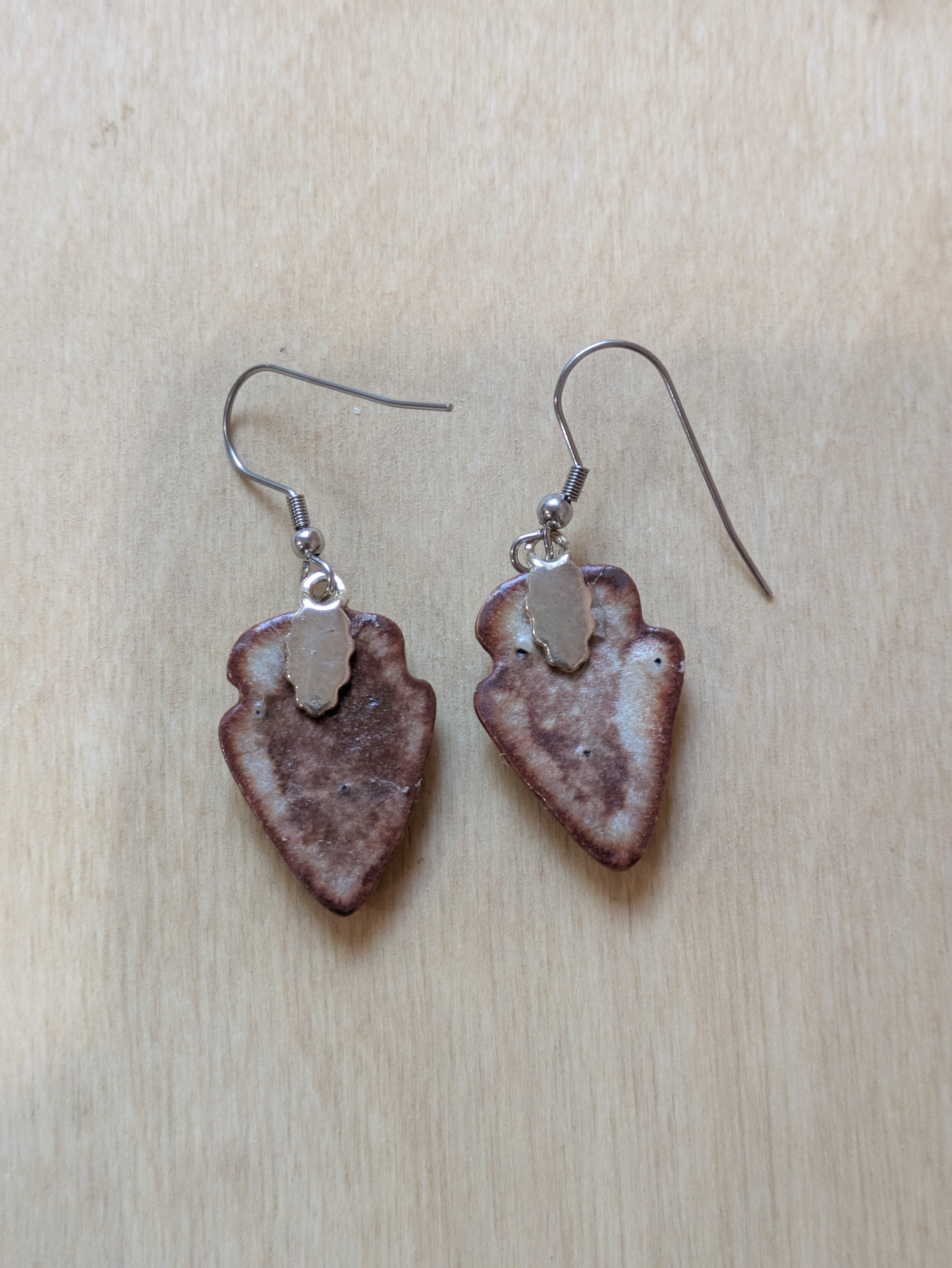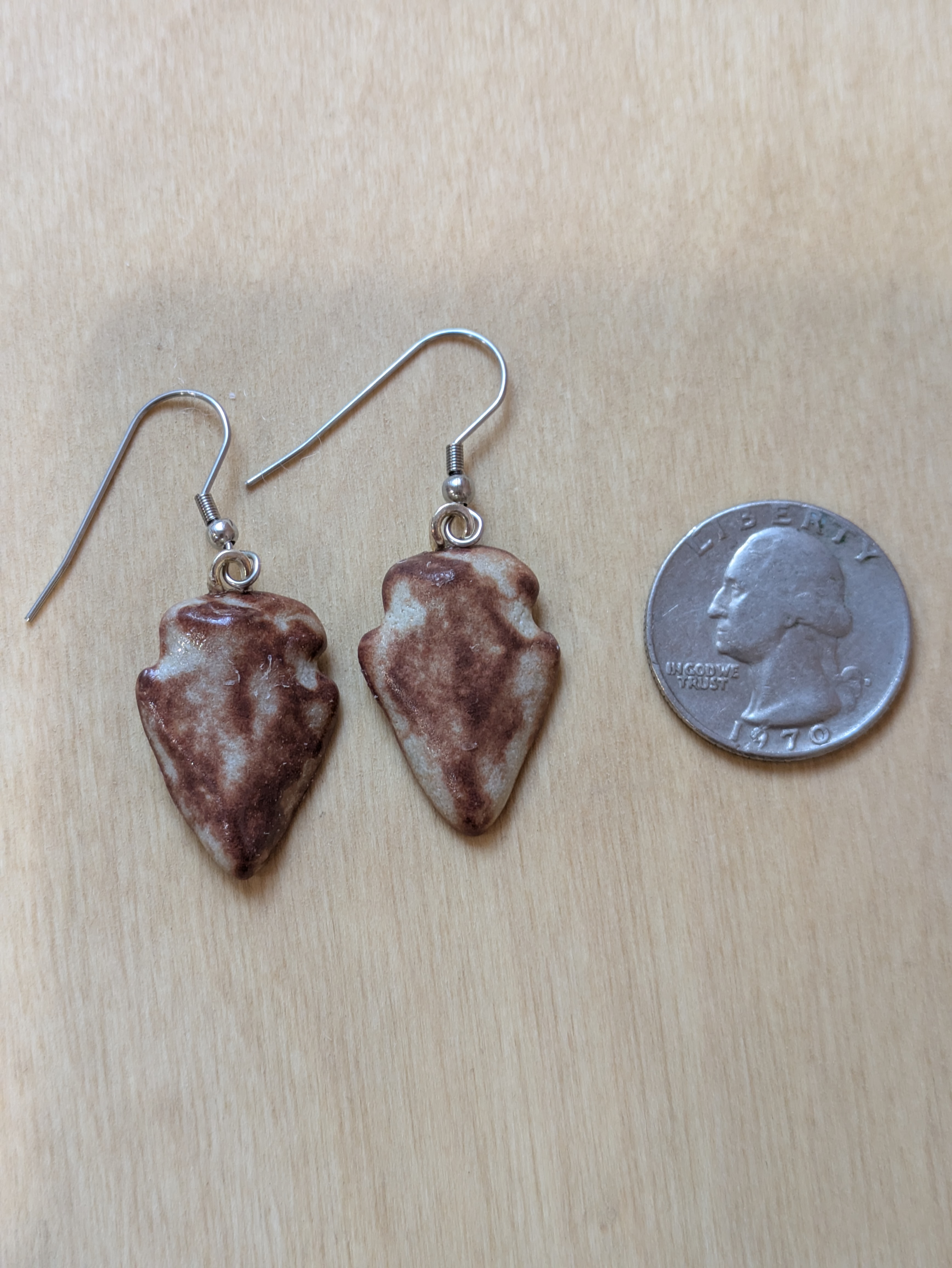 Pair of ceramic earrings shaped like arrowheads that I made by hand using white stoneware clay. I used a food safe glaze that yields the earthy browns and beiges see in the photos. These cute earrings are attached to hypoallergenic stainless steel fishhook ear wires for pierced ears. One of the most common comments I hear when people pick these up in-person is "they're much lighter than I thought they would be." I make my earrings fairly thin and they weigh-in at 4 grams each. For the non-metrics out there: this is equivalent to 0.148 ounces. Measures 1" long x 0.5" wide at the largest measurements (please see the photo with the quarter for scaling). The entire earring has been glazed - see the last picture which shows the backside and the 3 "stilt" marks that result from choosing to glaze all surfaces - the earring must be elevated off the kiln shelf using high-temperature wire and a support or else the earring would fuse to the shelf during the firing.