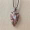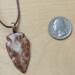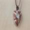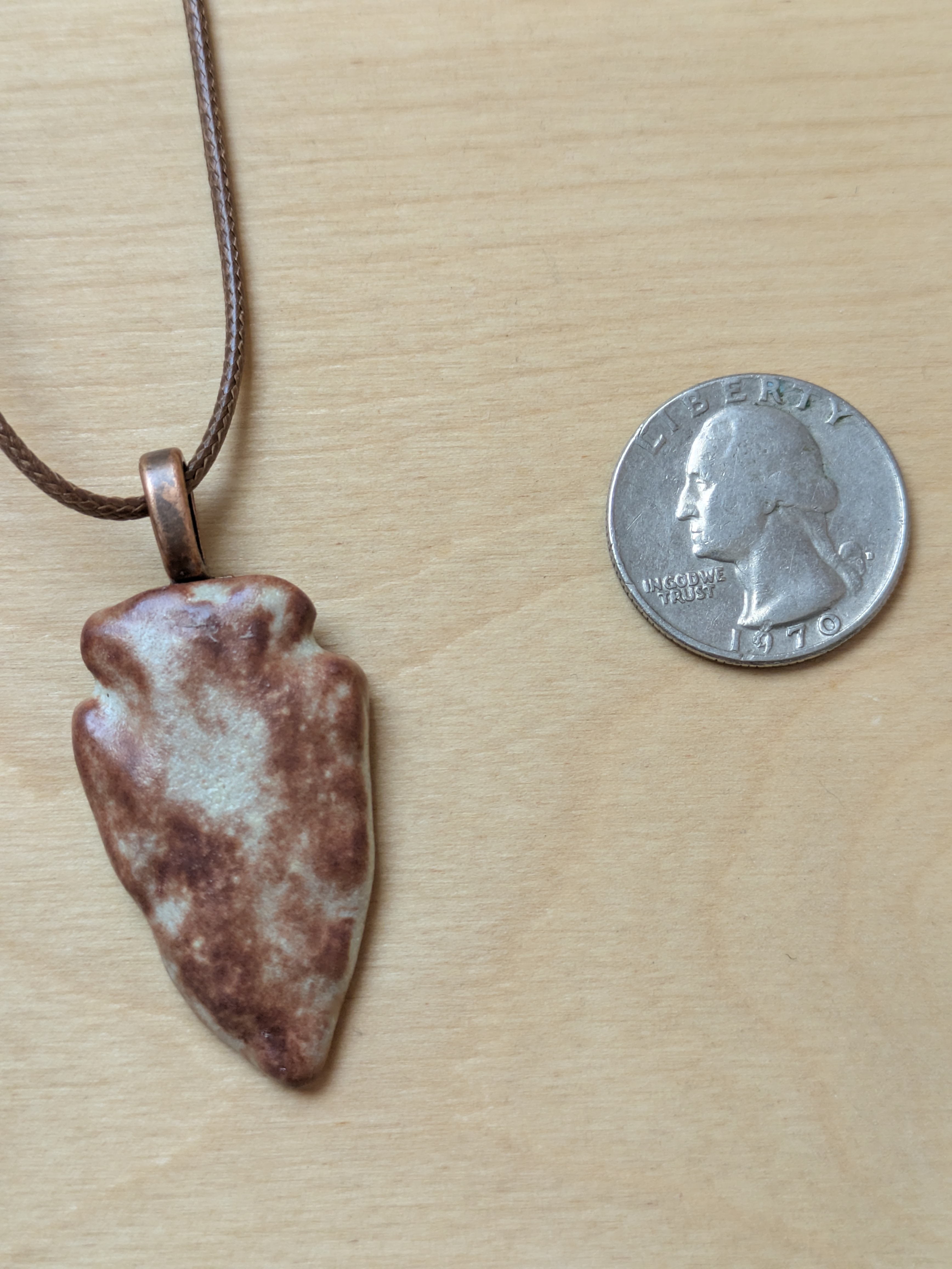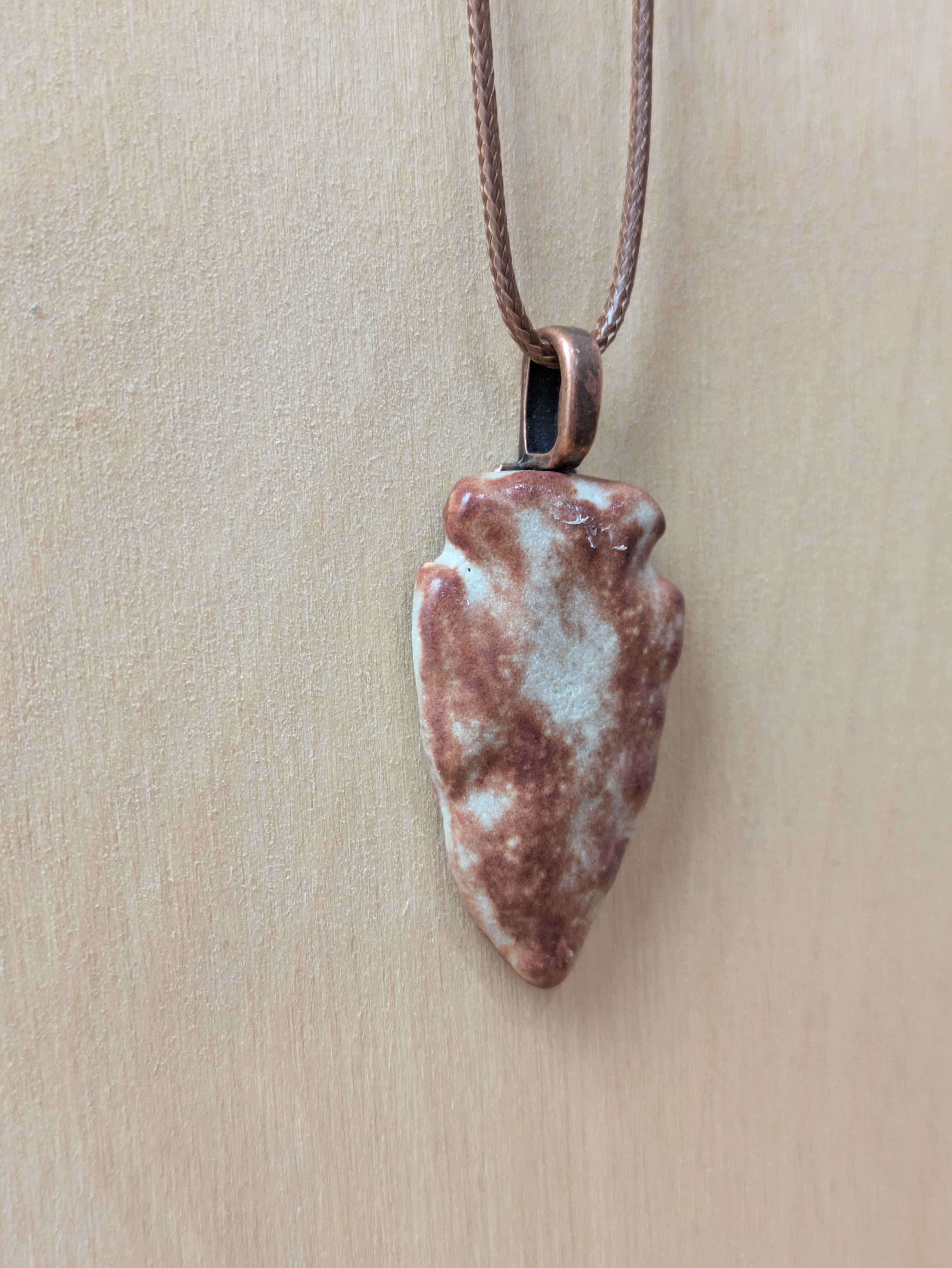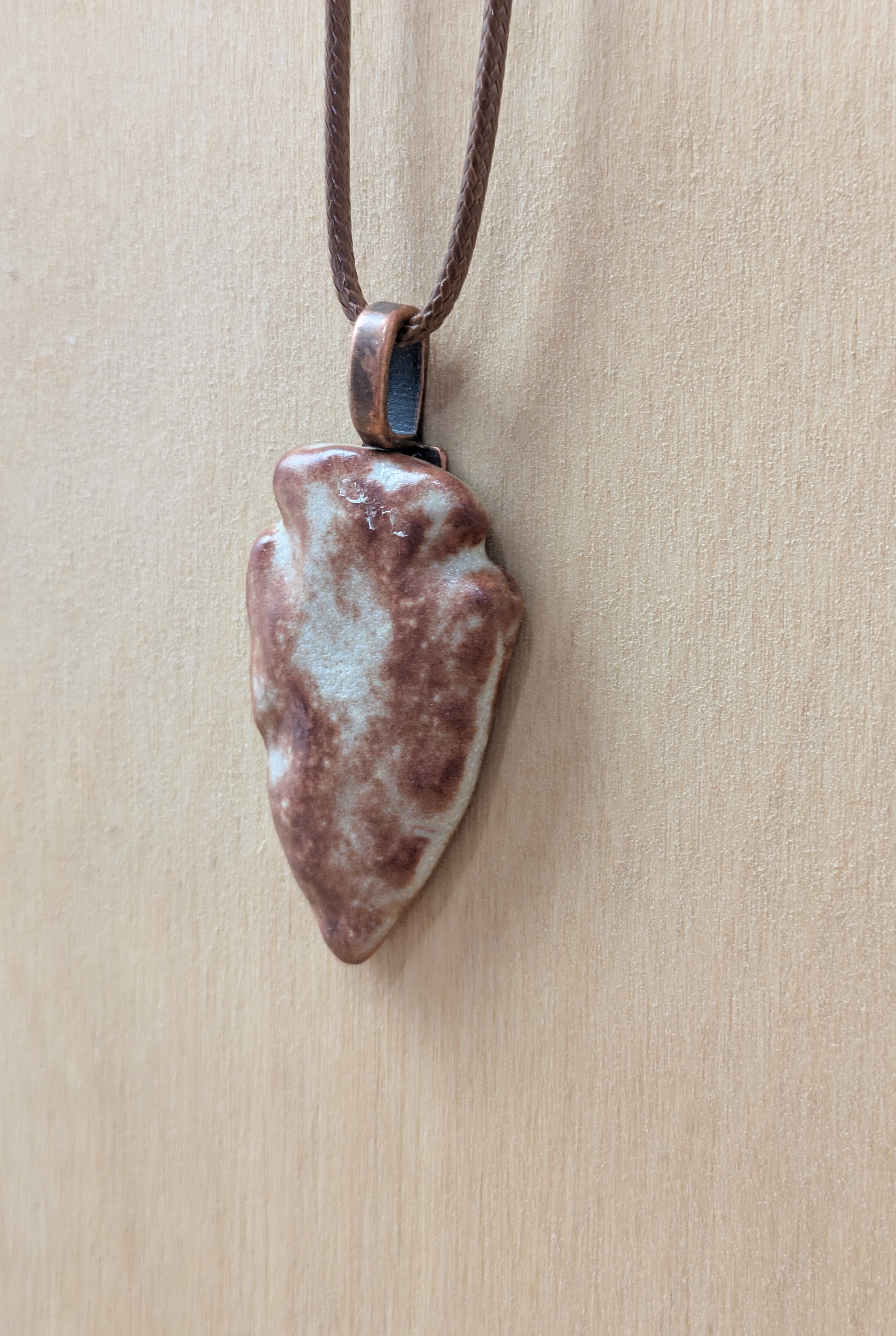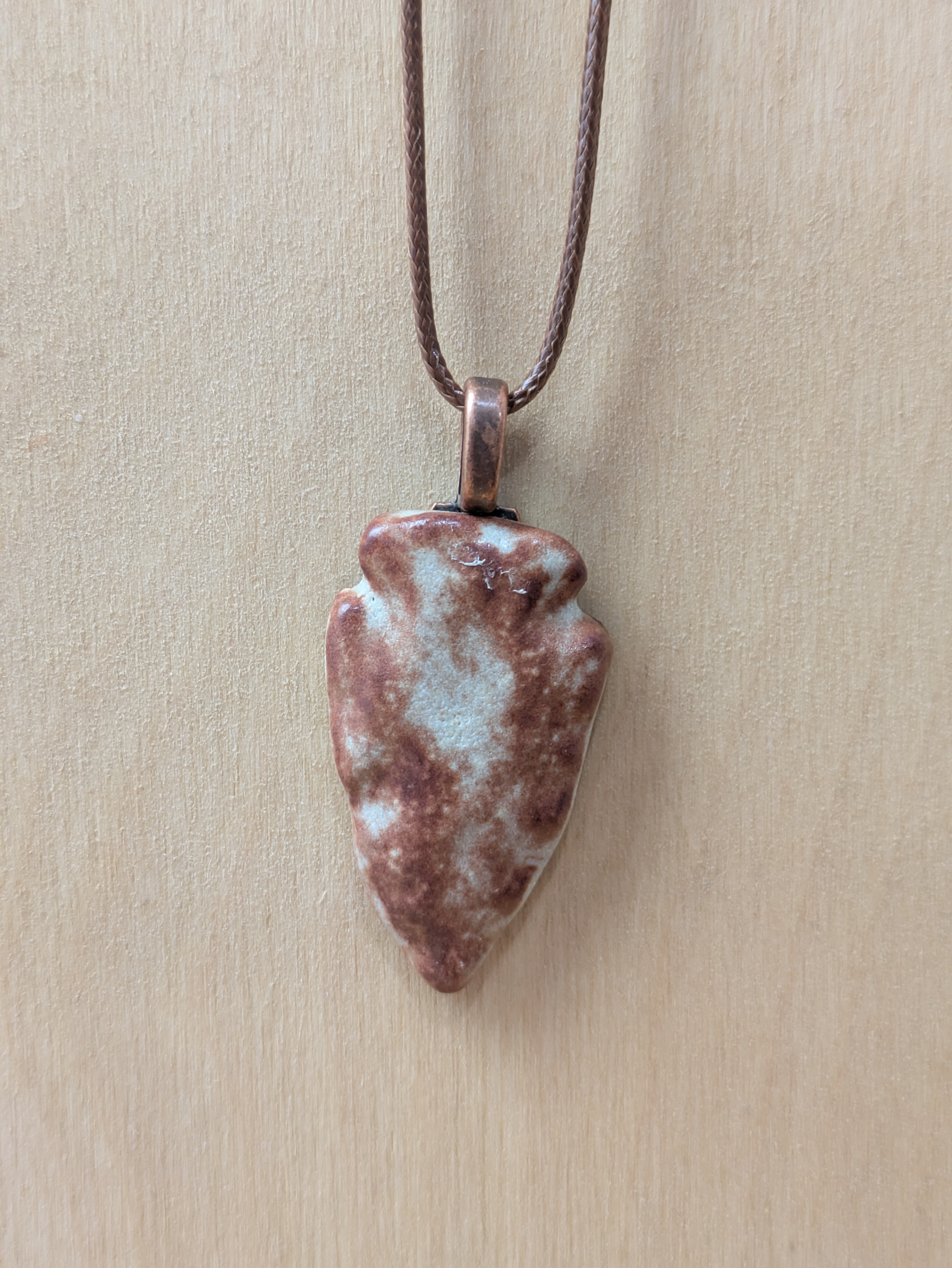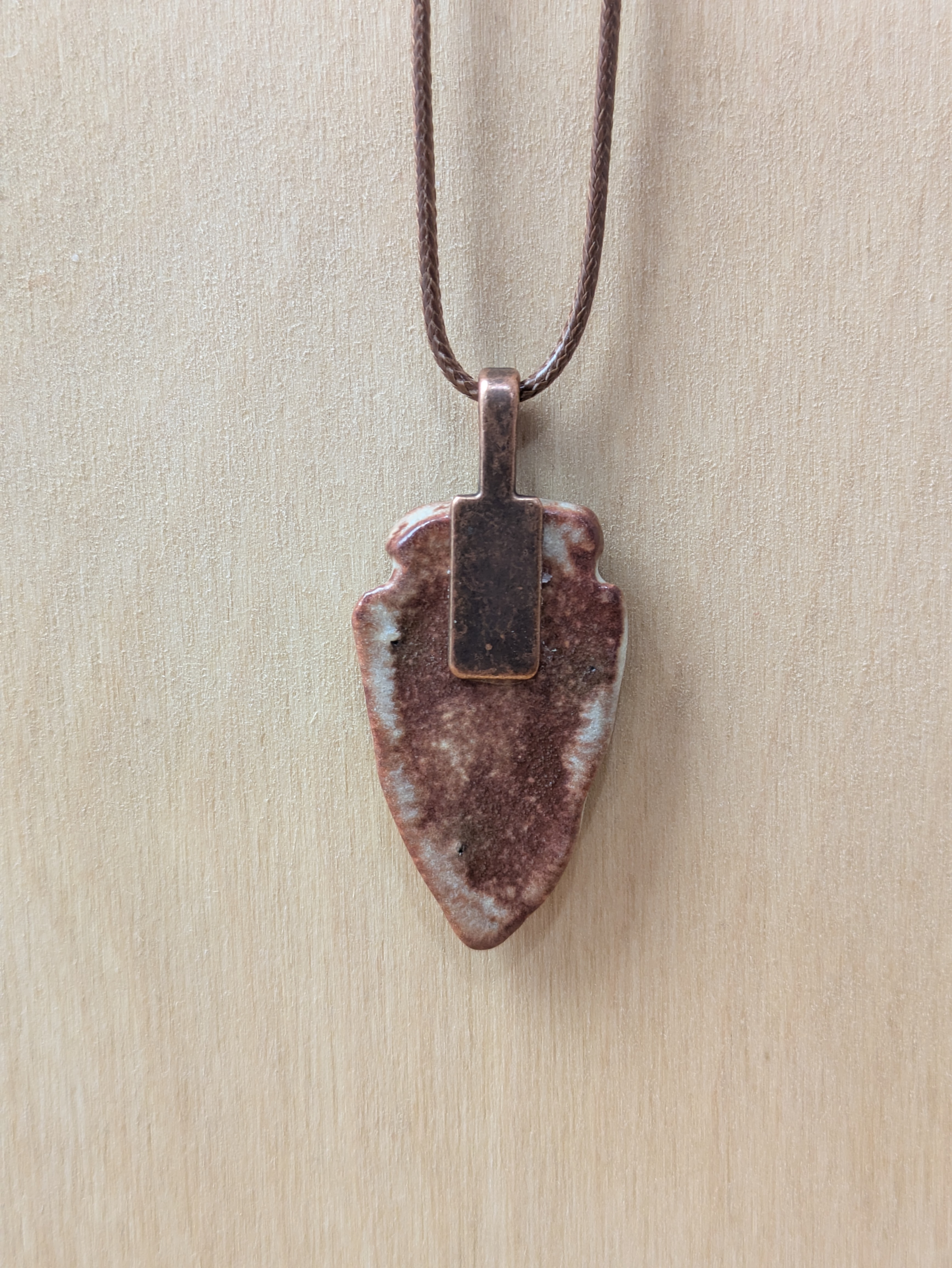 Arrowhead shaped ceramic pendant necklace that I made by hand using white stoneware clay. I choose an earthy brown and beige glaze for this pendant. 24" brown waxed cotton cord with lobster claw clasp. Pendant is 1.5" long x 0.9" wide at its largest measurements. (See the picture with a quarter for scaling). The edges and backside have also been glazed.