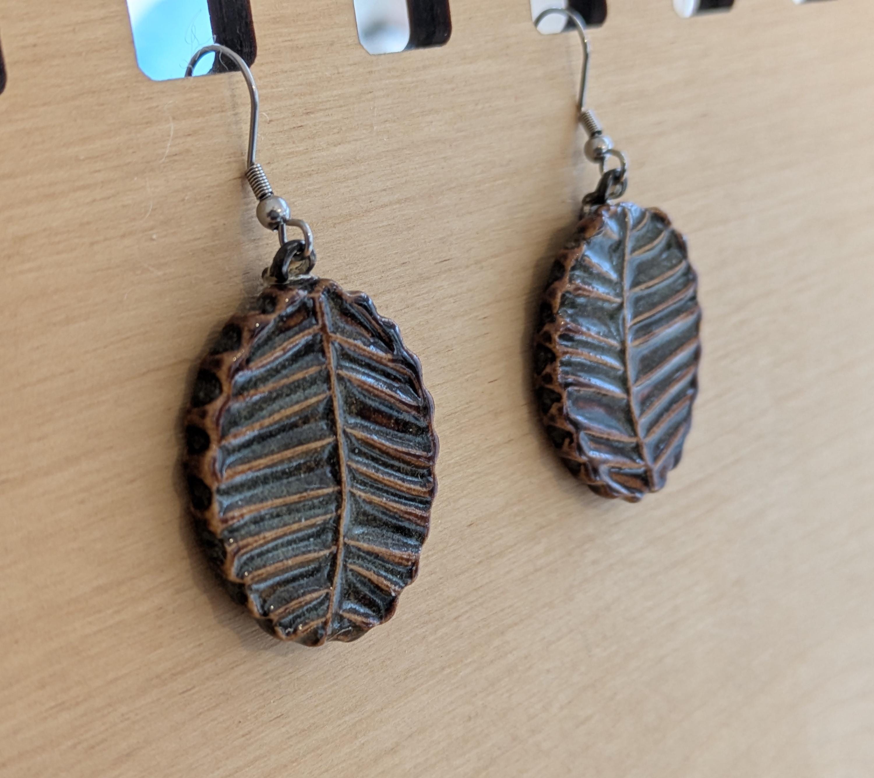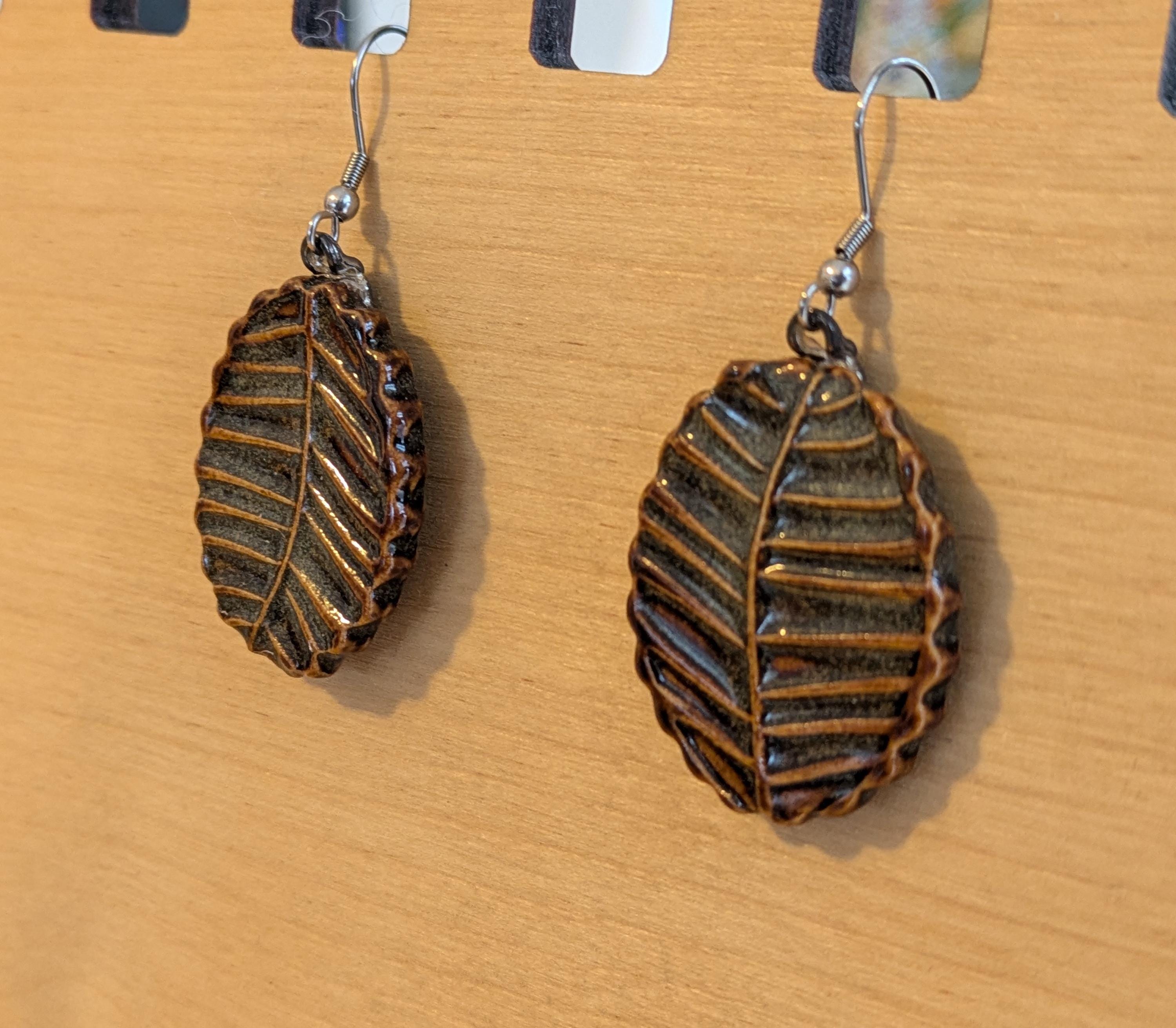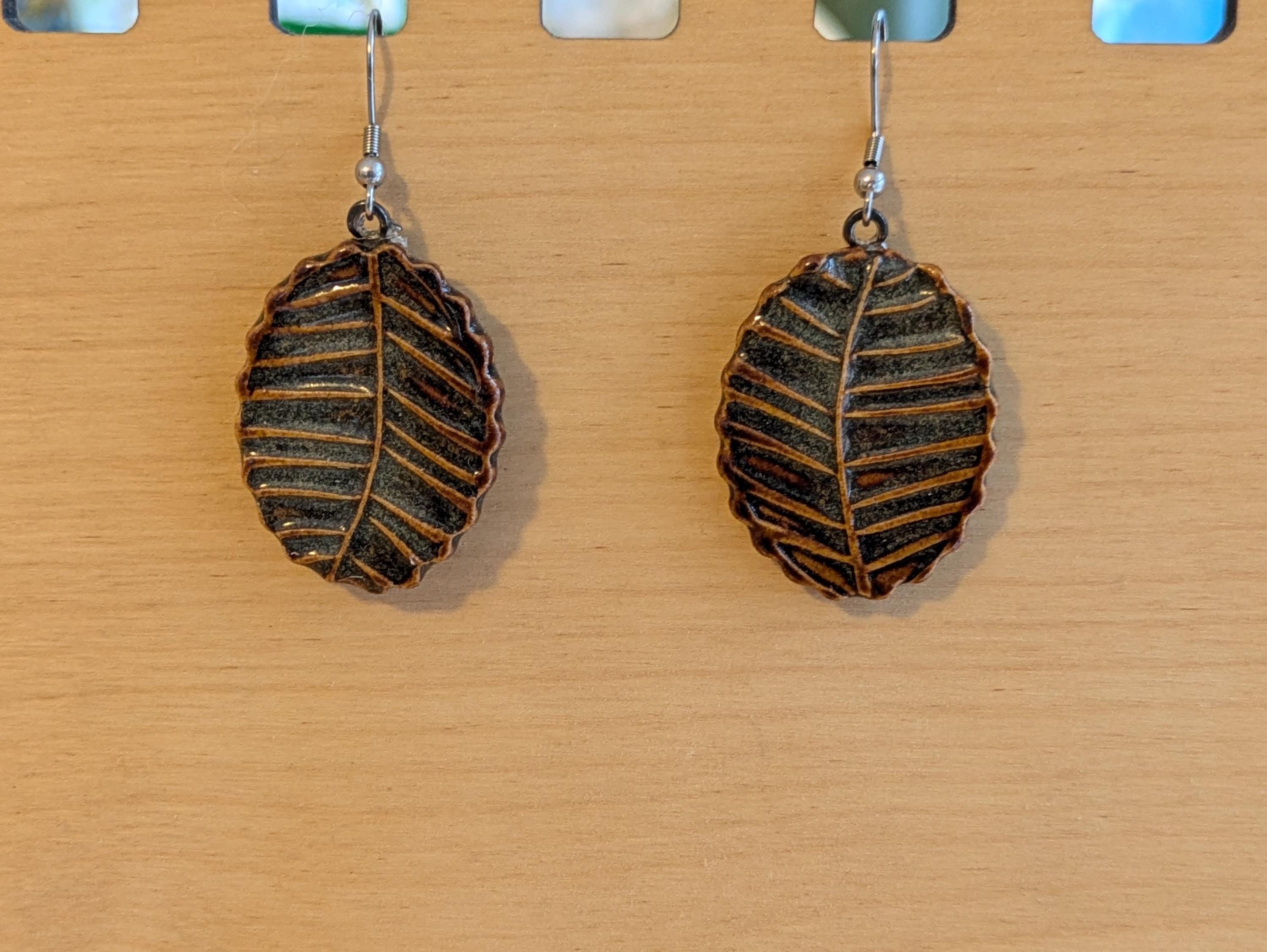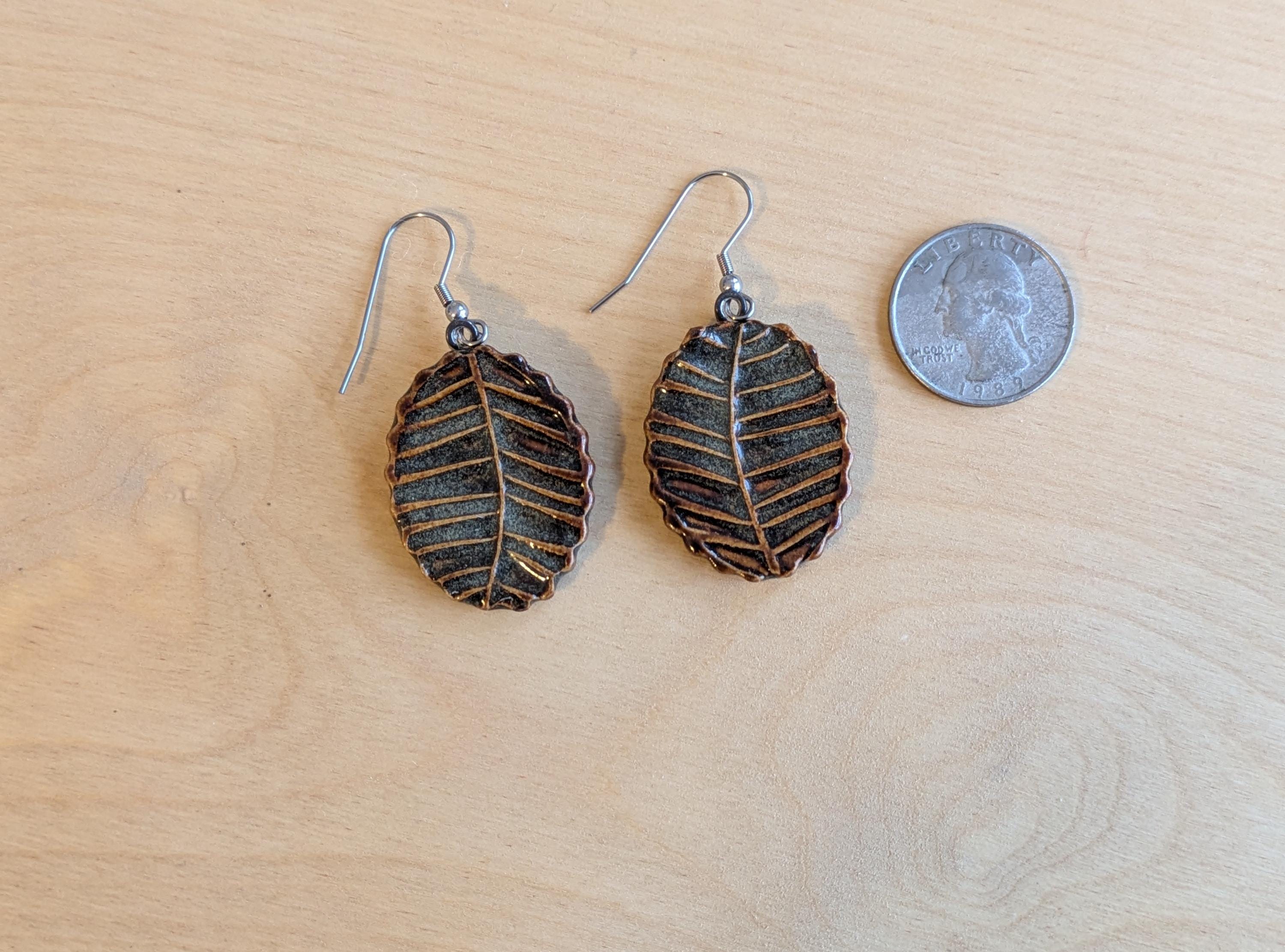 Pair of ceramic earrings that I made by hand using white stoneware clay. The front is textured with leaf veining - perfect for the lover of nature and the outdoors! I chose a glaze that gives off a brown vibe but has some variegation with greys. These cute earrings are attached to hypoallergenic stainless steel fishhook ear wires for pierced ears. One of the most common comments I hear when people pick these up in-person is "they're much lighter than I thought they would be." I make my earrings fairly thin and they weigh-in at 8 grams each. For the non-metrics out there: this is equivalent to 0.28 ounces. Oval shape measures 1.25" long and 1" wide at the largest measurements (please see the photo with the quarter for scaling).