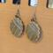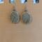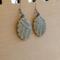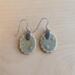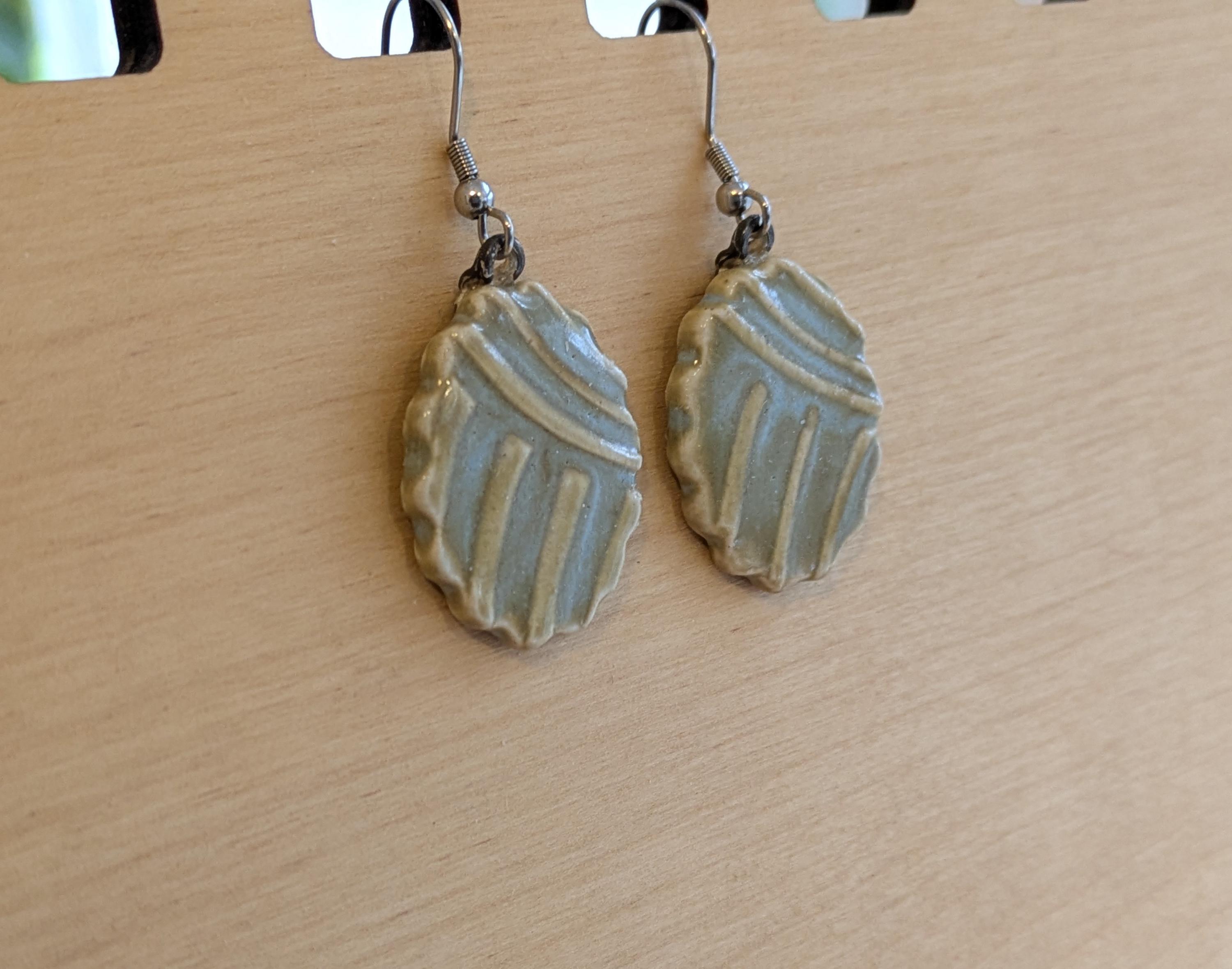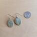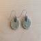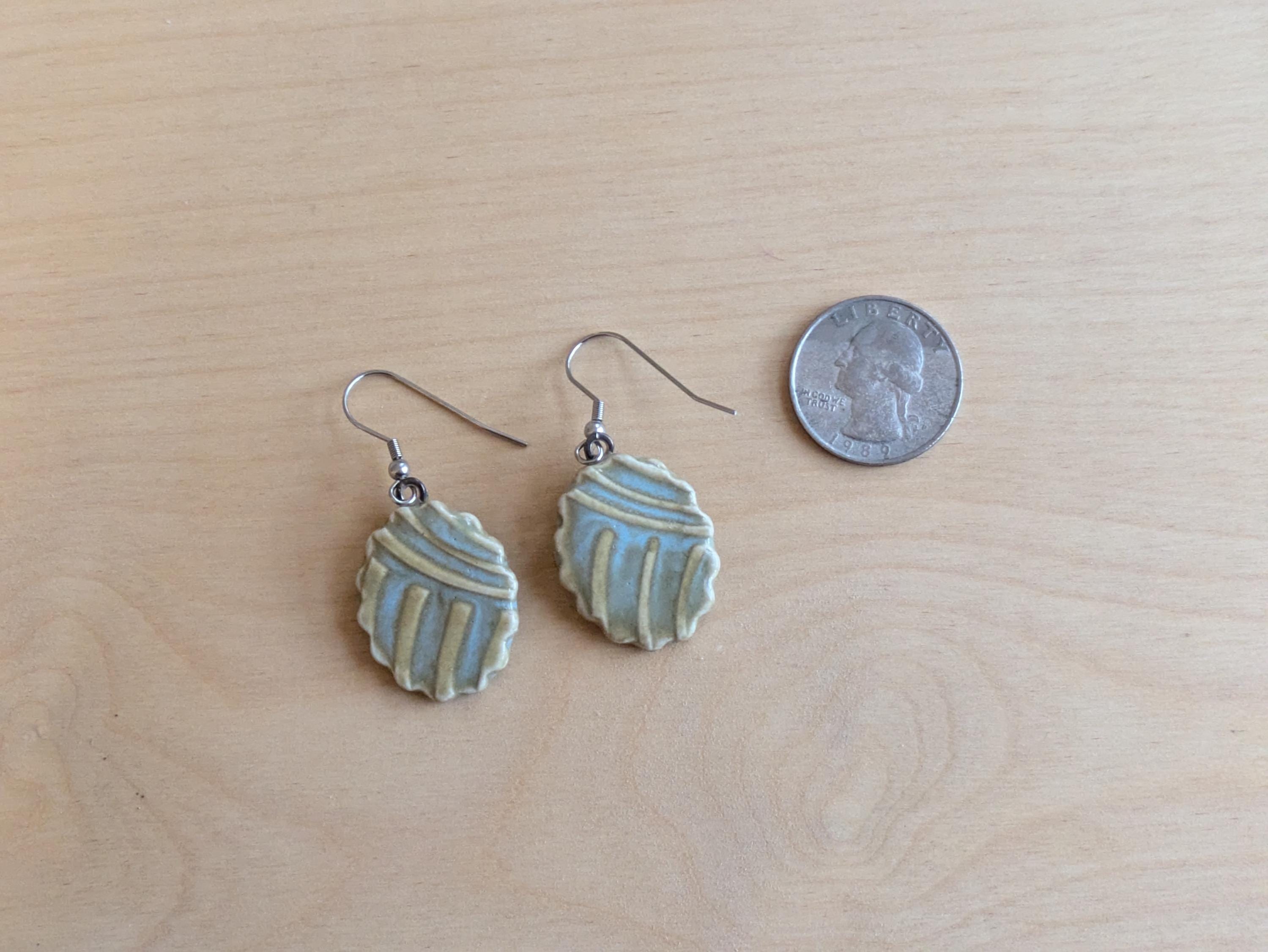 Pair of ceramic earrings that I made by hand using white stoneware clay. The front is textured with with a varying pattern and I chose to use a glaze that variegates light blue and ochre colors. These cute earrings are attached to hypoallergenic stainless steel fishhook ear wires for pierced ears. One of the most common comments I hear when people pick these up in-person is "they're much lighter than I thought they would be." I make my earrings fairly thin and they weigh-in at 4 grams each. For the non-metrics out there: this is equivalent to 0.148 ounces. Oval shape measures 1" long and 0.75" wide at the largest measurements (please see the photo with the quarter for scaling).