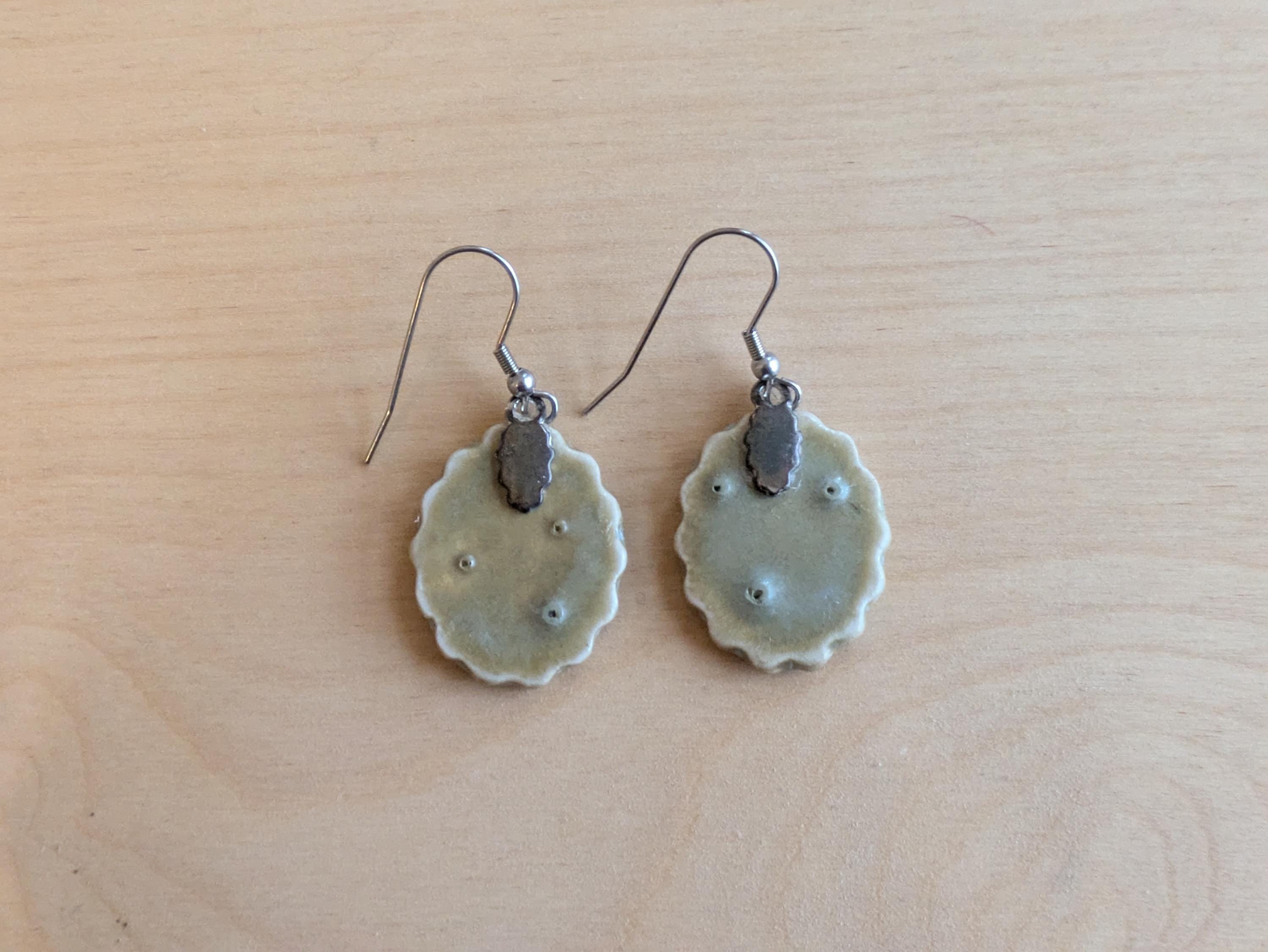 The entire earring has been glazed - see the last picture which shows the backside and the 3 "stilt" marks that result from choosing to glaze all surfaces - the earring must be elevated off the kiln shelf using high-temperature wire and a support or else the earring would fuse to the shelf during the firing.