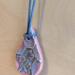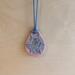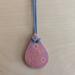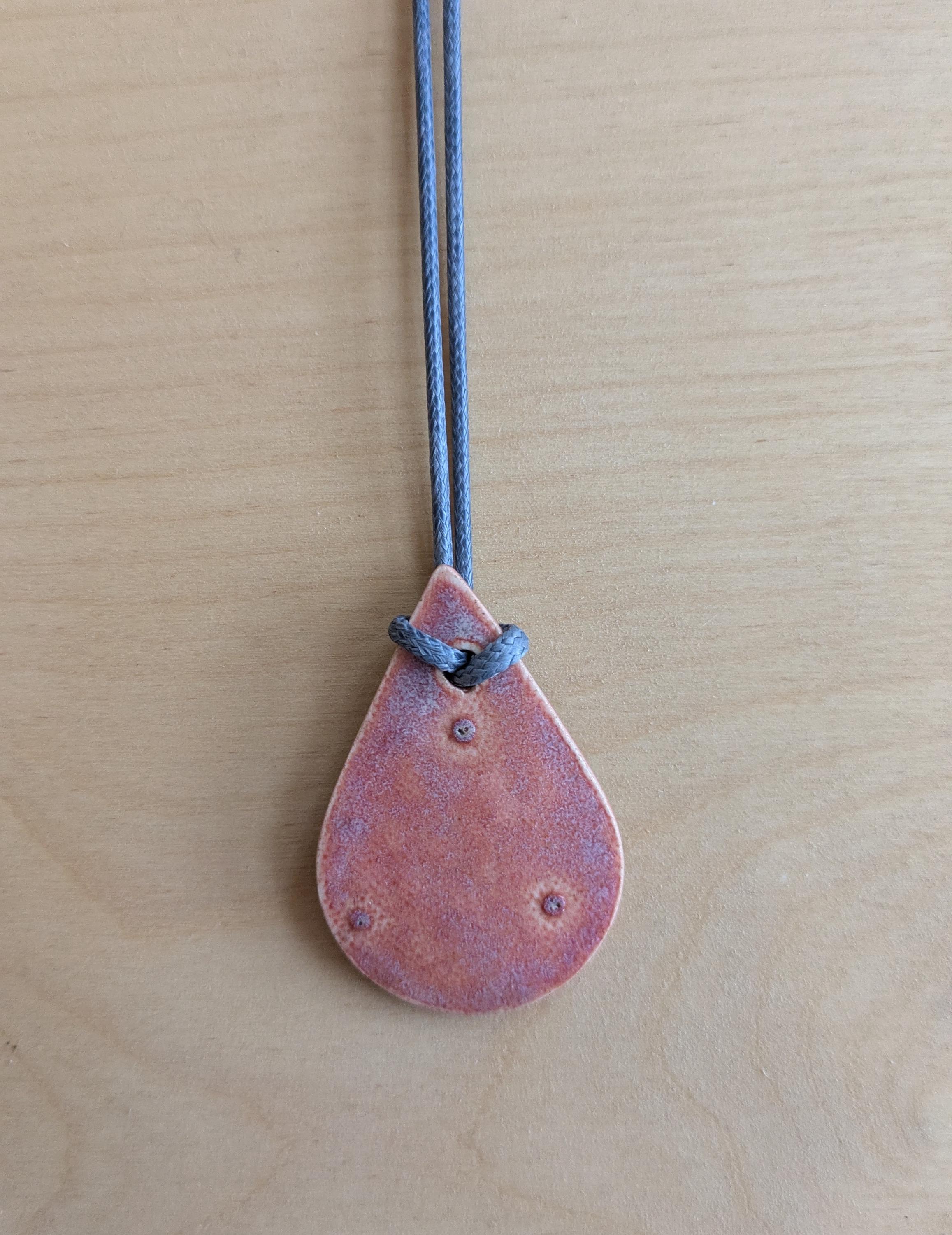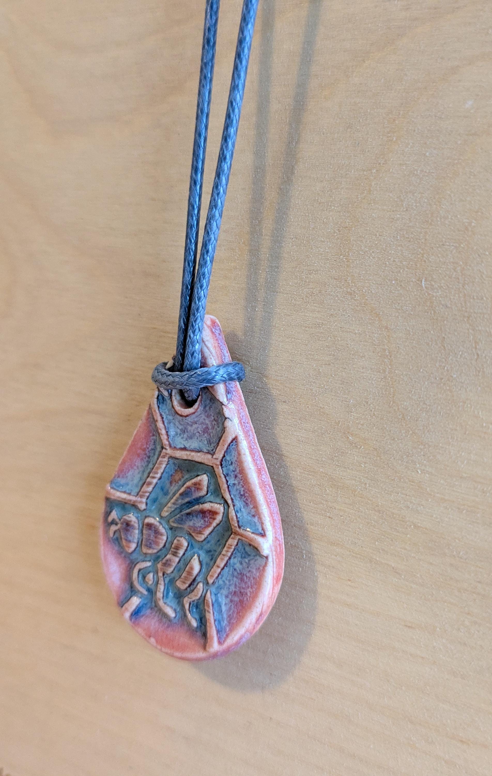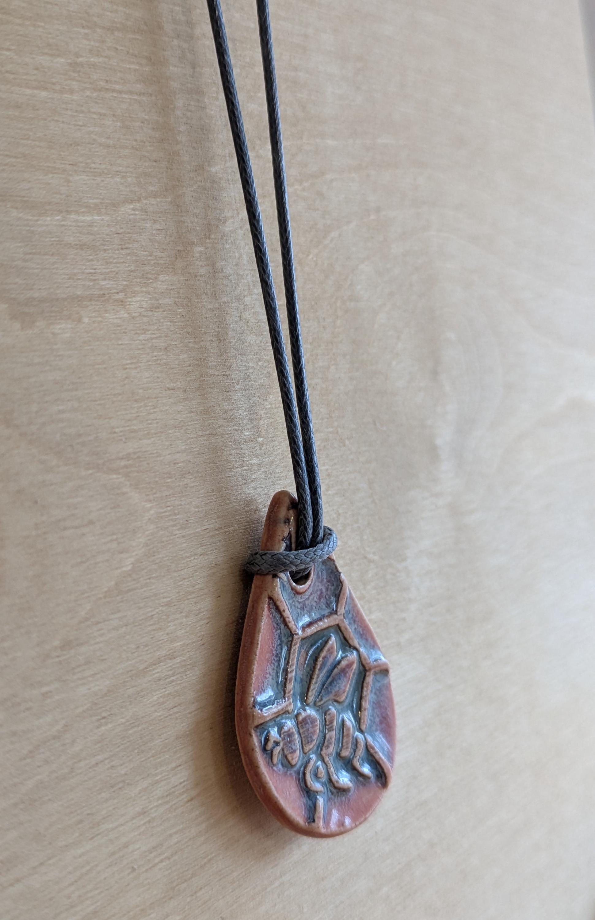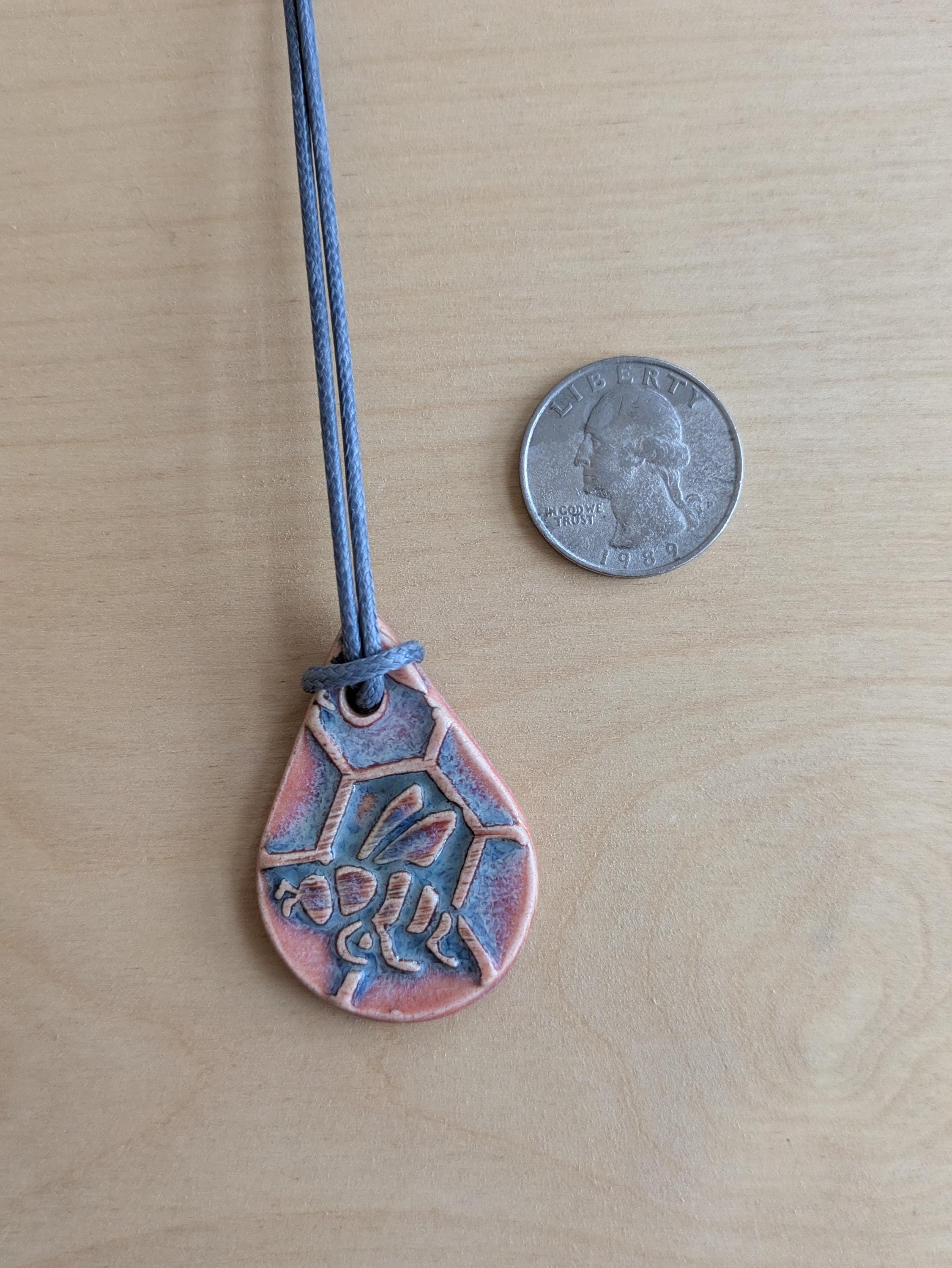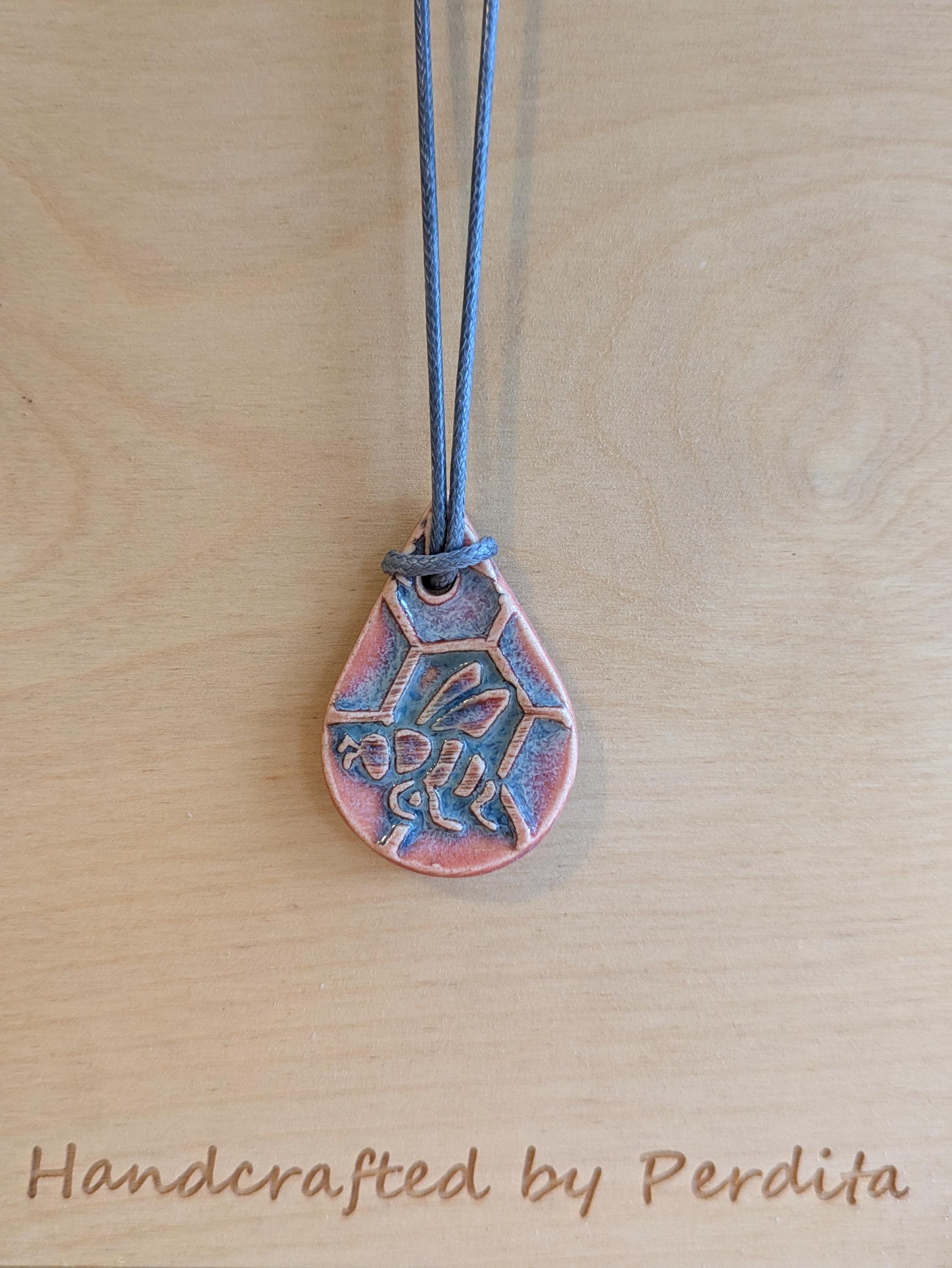 Teardrop shaped ceramic pendant necklace that I made by hand using white stoneware clay. I textured the front of the pendant with a bee and honeycomb and chose a glaze that variegates nicely with pinks and greys. 18" grey waxed cotton adjustable cord with lobster claw clasp. Pendant is 1.75" long x 1" wide. (See the picture with a quarter for scaling).
