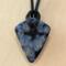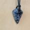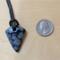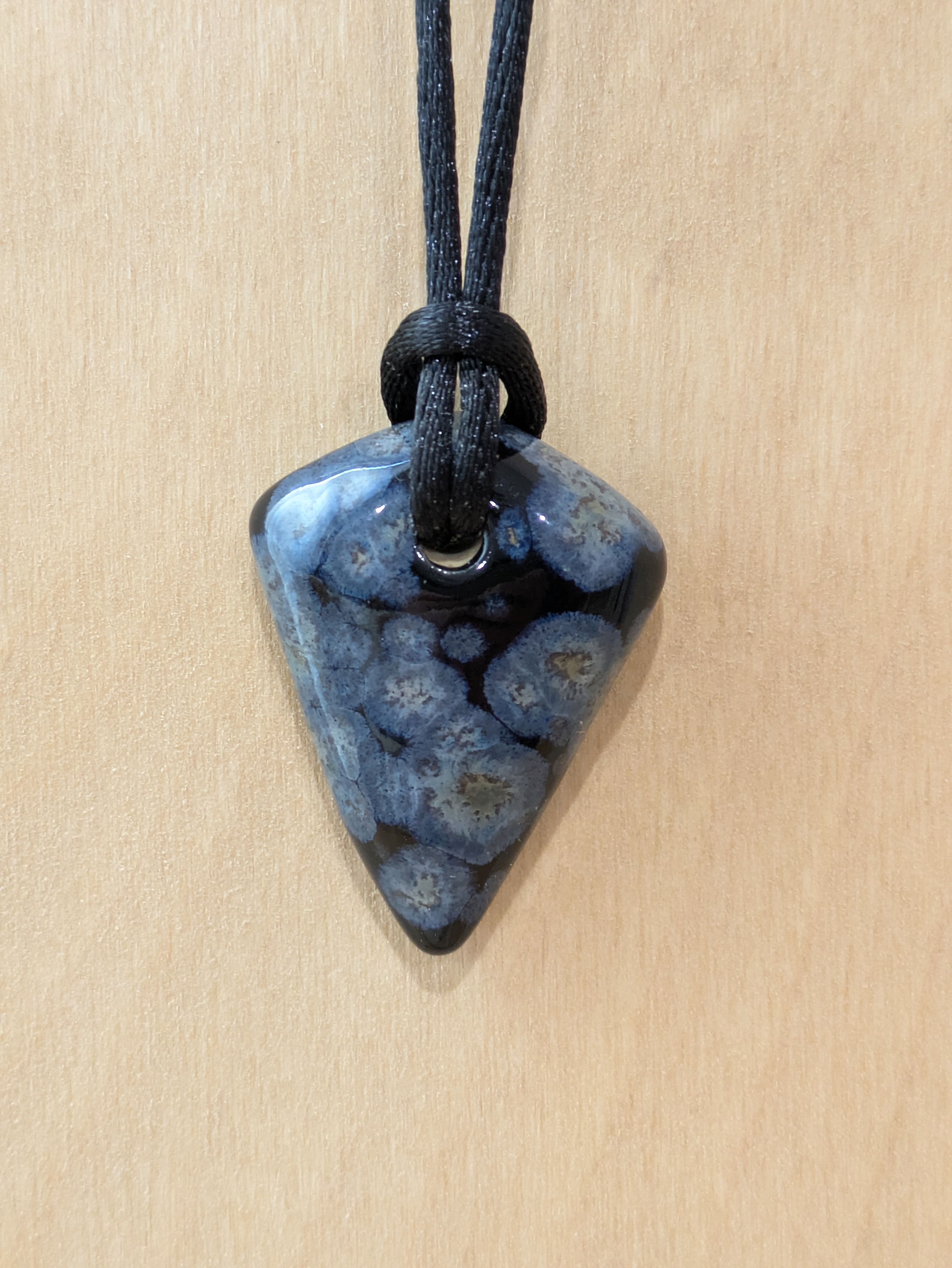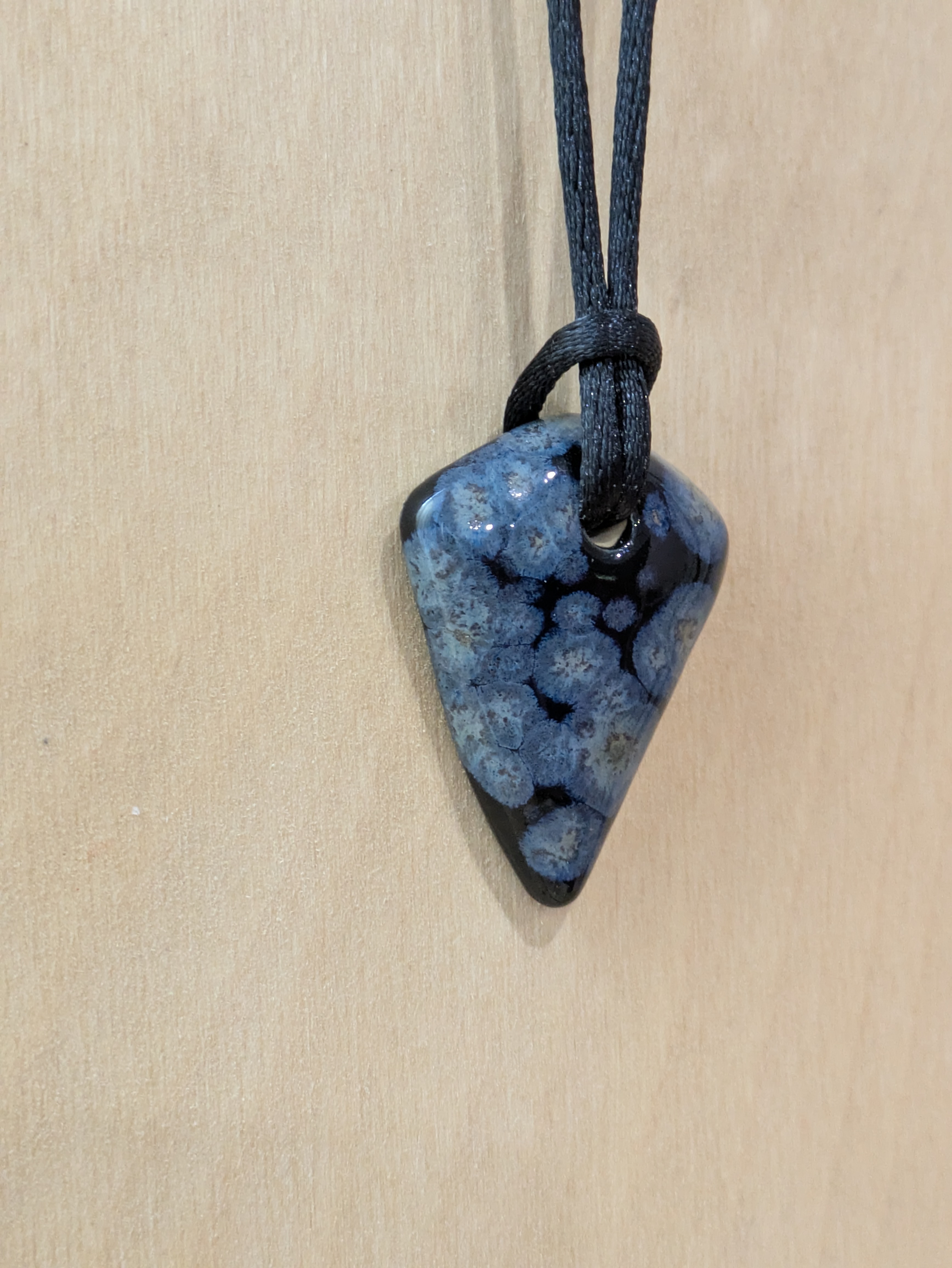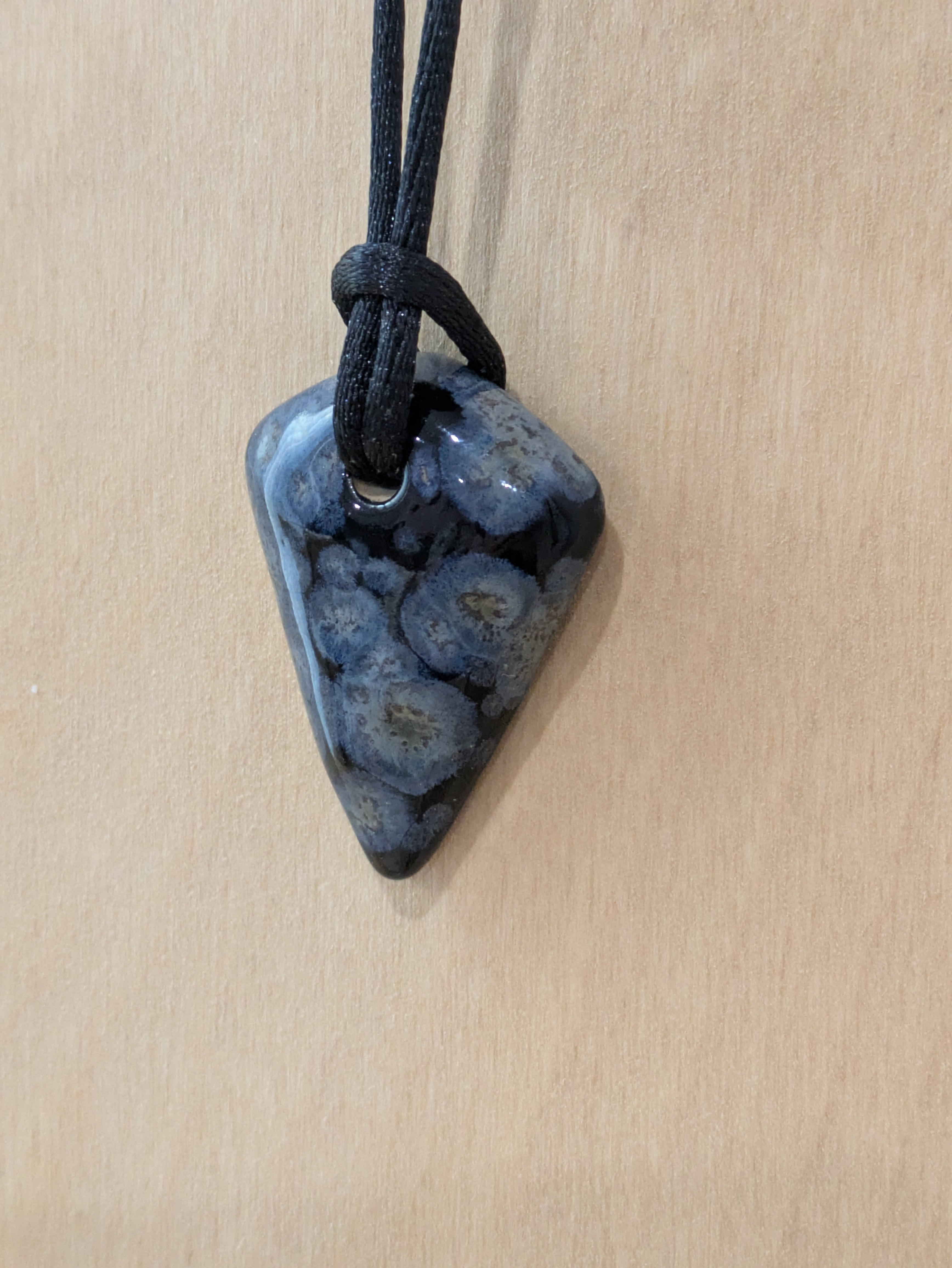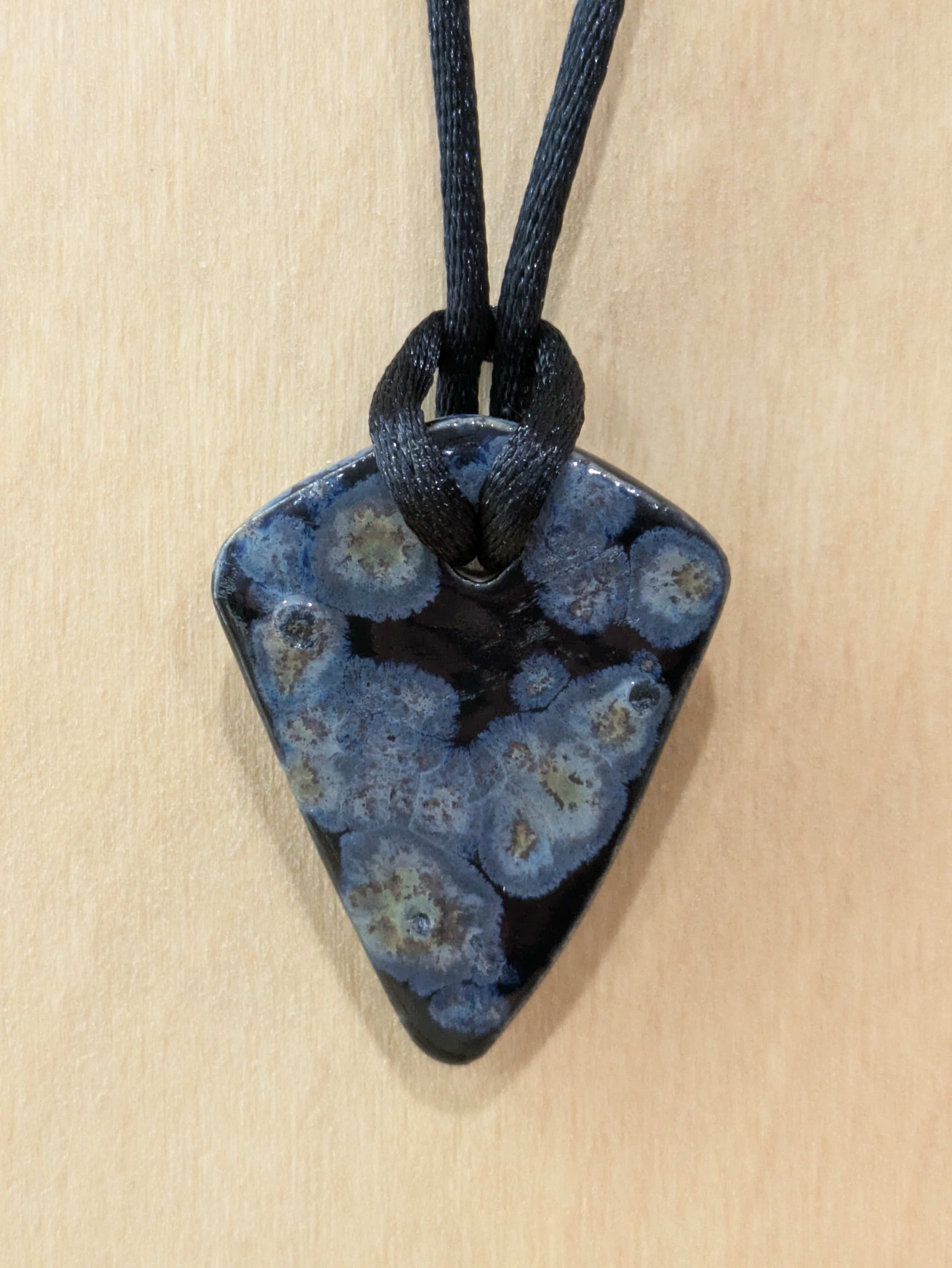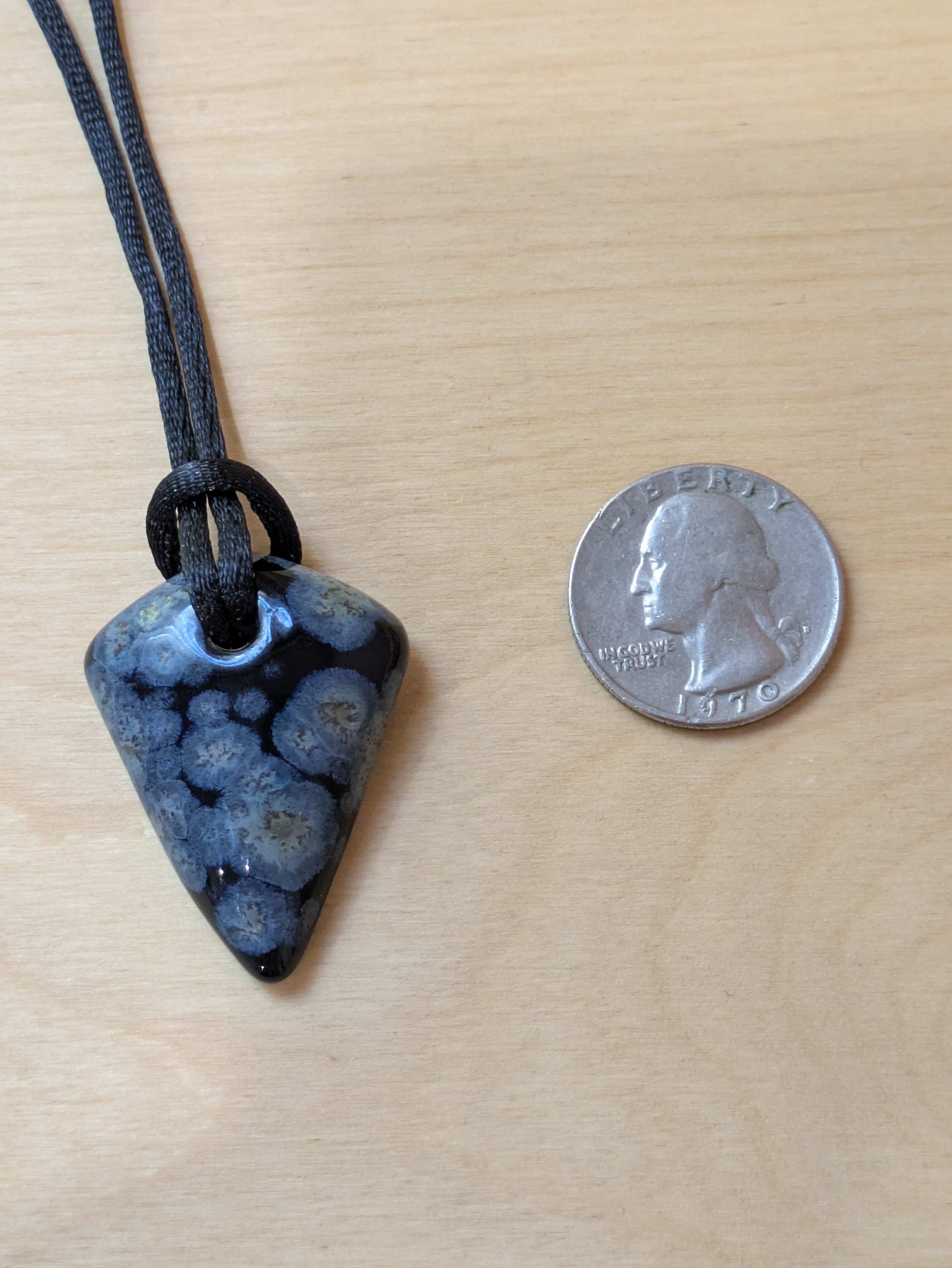 Inverted Triangle Cabochon Shape ceramic pendant necklace that I made by hand using white stoneware clay. I used food safe glazes with crystals in them that burst during firing to achieve the one-of-a-kind glaze results you see in the pictures. 24" black satin adjustable cord with lobster claw clasp. Pendant is 1.4" long and 1.1" wide at its largest dimensions. (See the picture with a quarter for scaling). The edges and backside have also been glazed - see the last picture of the pendant which shows the backside and the 3 "stilt" marks that result from choosing to glaze all surfaces - the pendant must be elevated off the kiln shelf using high-temperature wire and a support or else the pendant would fuse to the shelf during the firing.