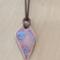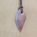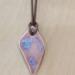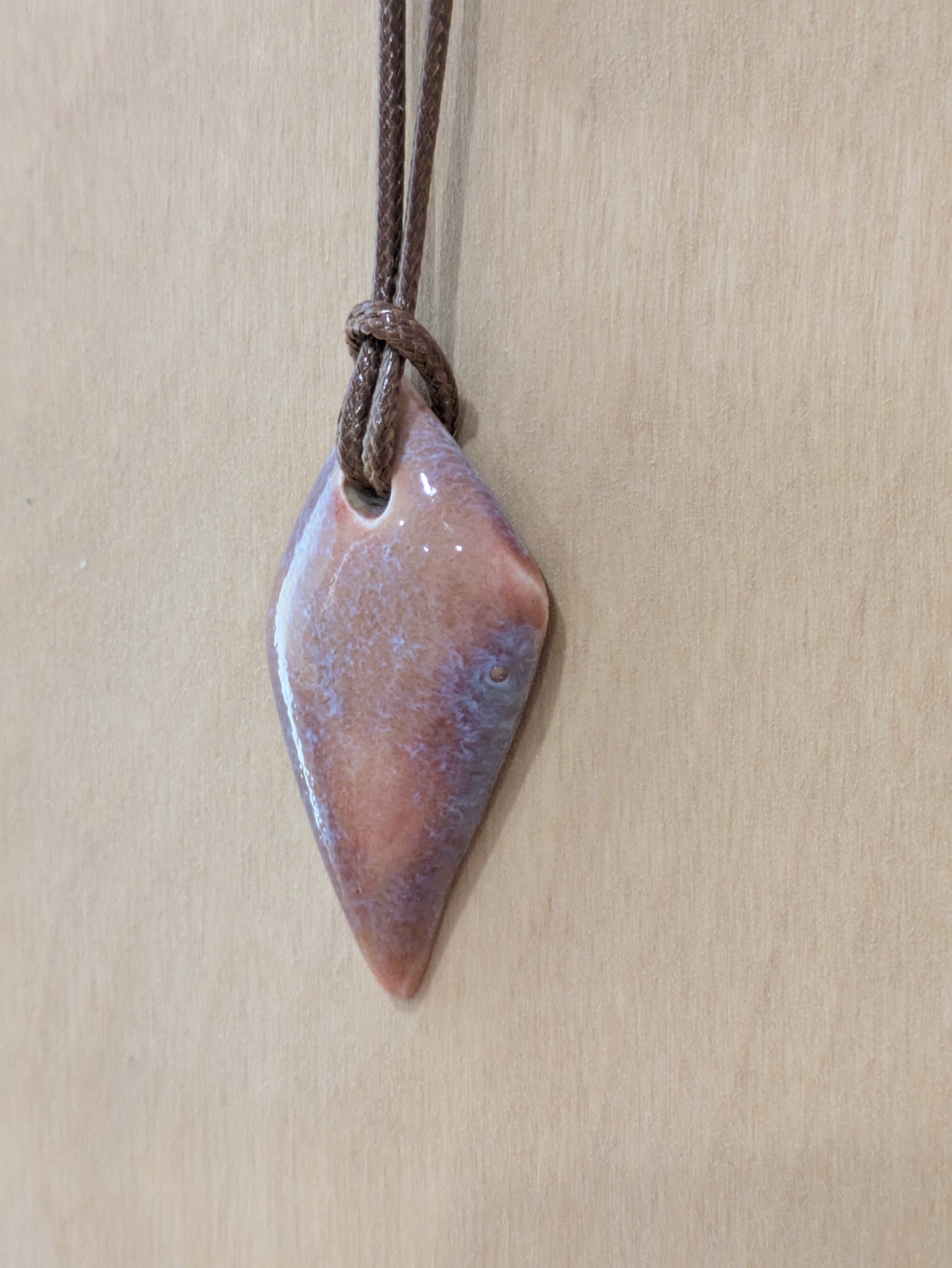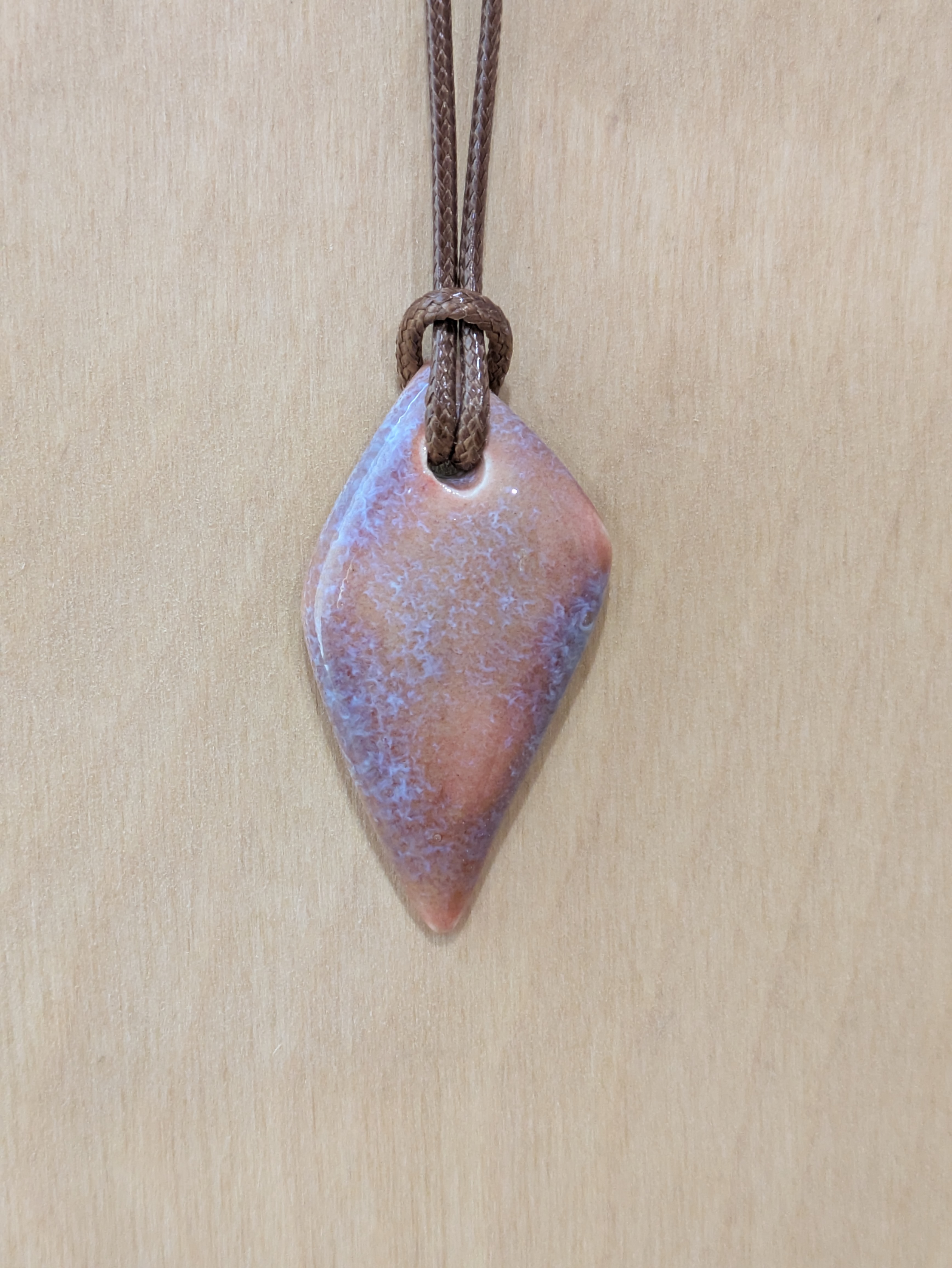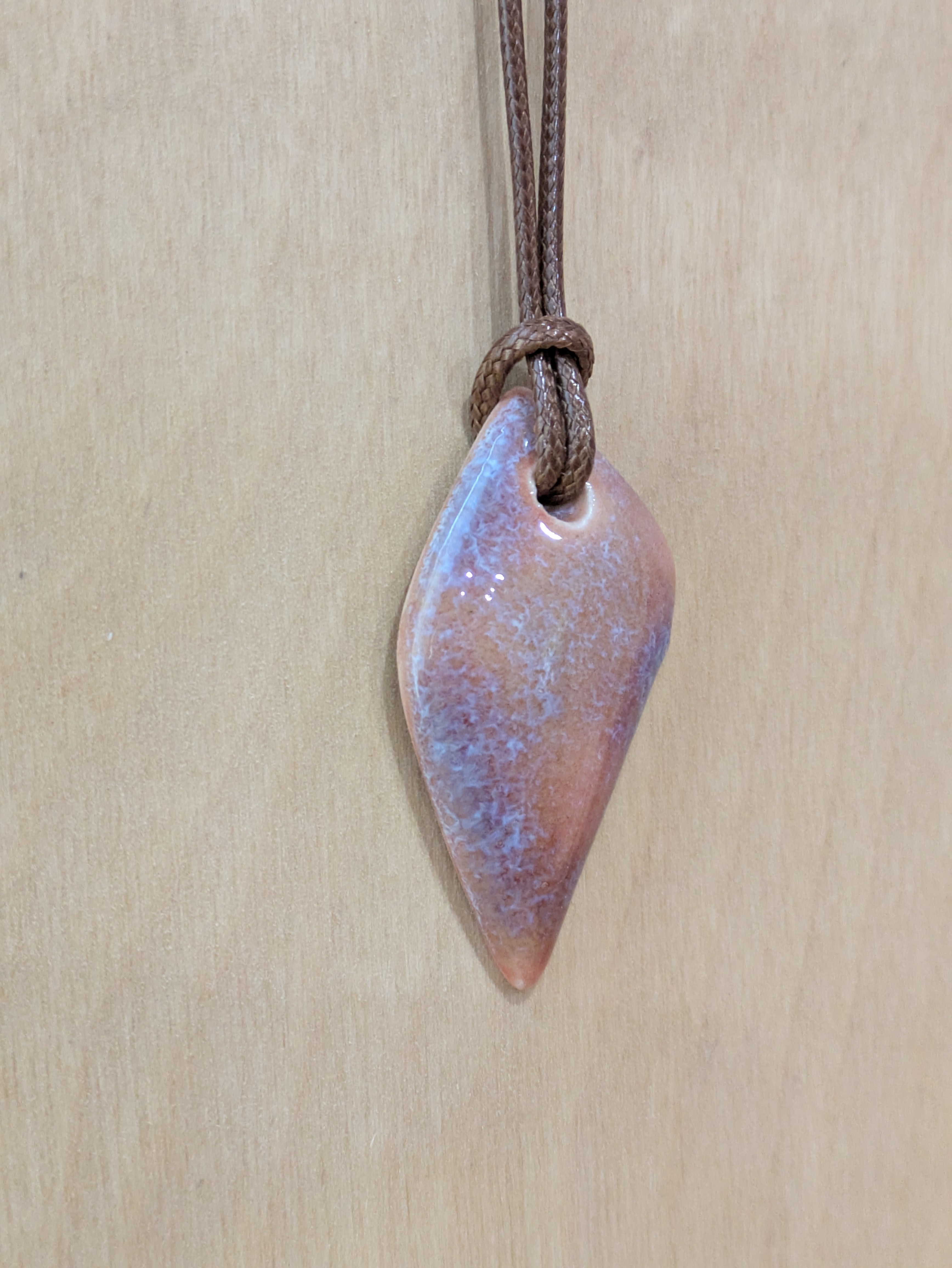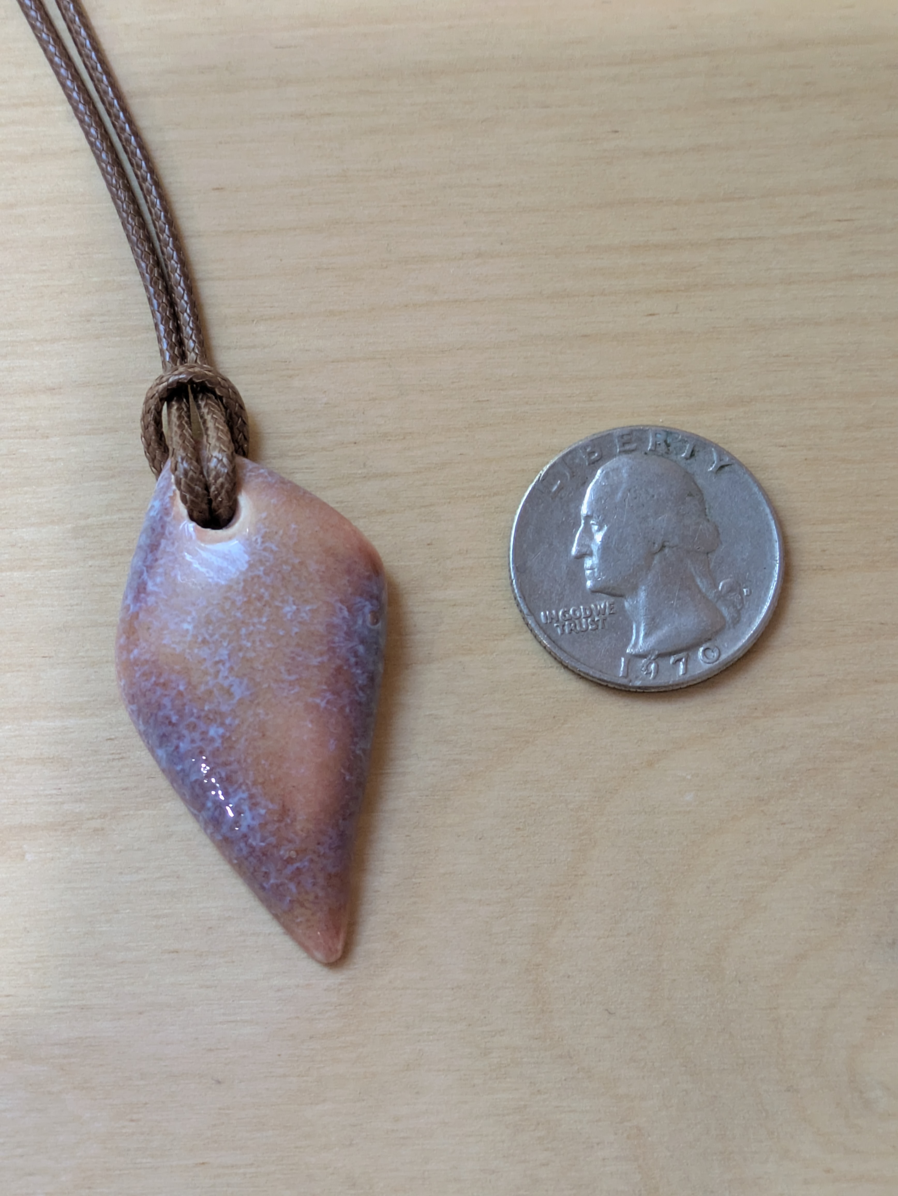 Asymmetrical Cabochon Shape ceramic pendant necklace that I made by hand using white stoneware clay. I used food safe reactive glaze to obtain the fabulous results you see in the pictures. 24" light brown waxed cotton adjustable cord with lobster claw clasp. Pendant is 1.75" long and 1.0" wide at its largest dimensions. (See the picture with a quarter for scaling). The edges and backside have also been glazed - see the last picture of the pendant which shows the backside and the 3 "stilt" marks that result from choosing to glaze all surfaces - the pendant must be elevated off the kiln shelf using high-temperature wire and a support or else the pendant would fuse to the shelf during the firing.