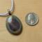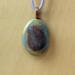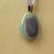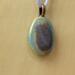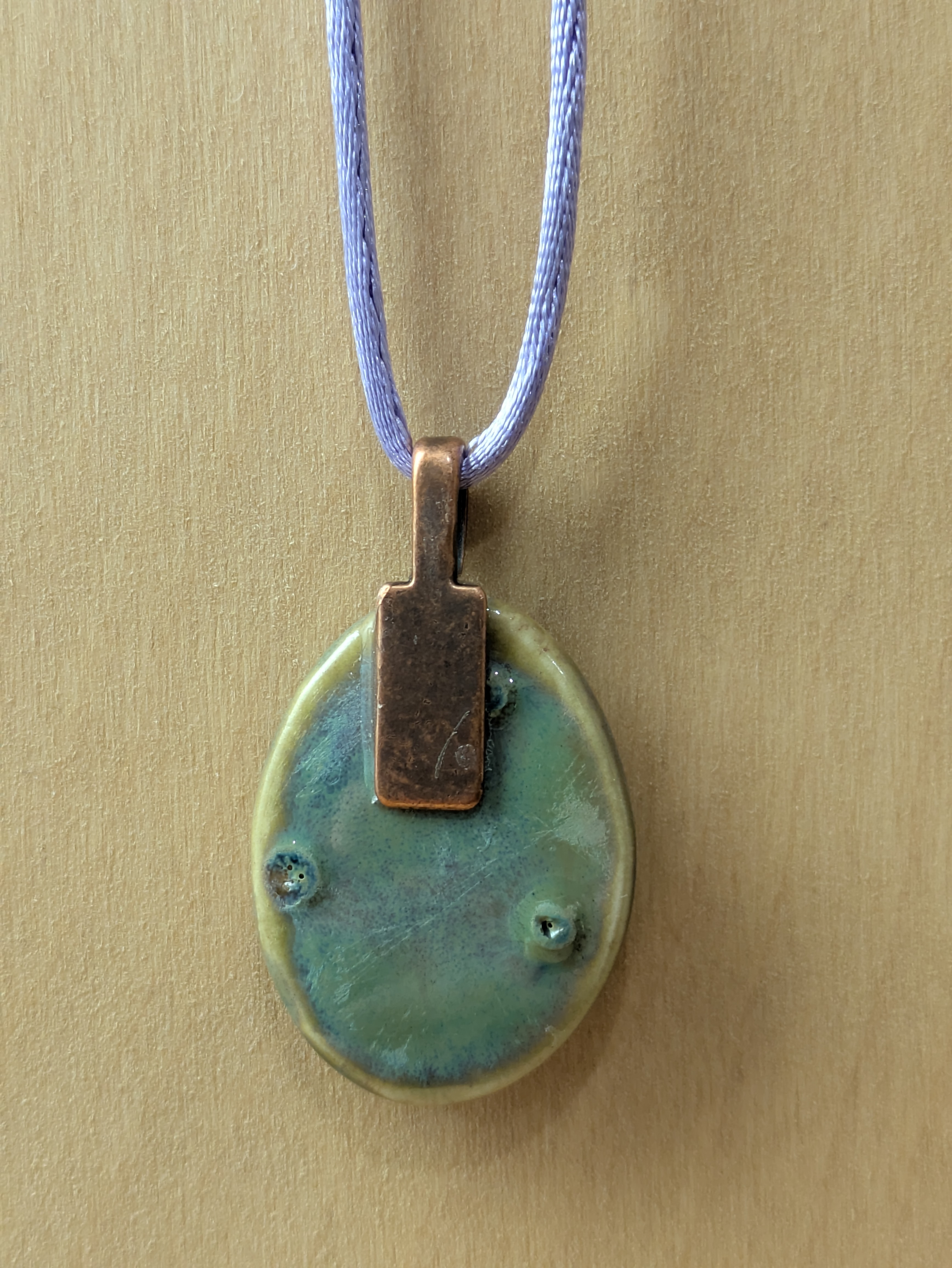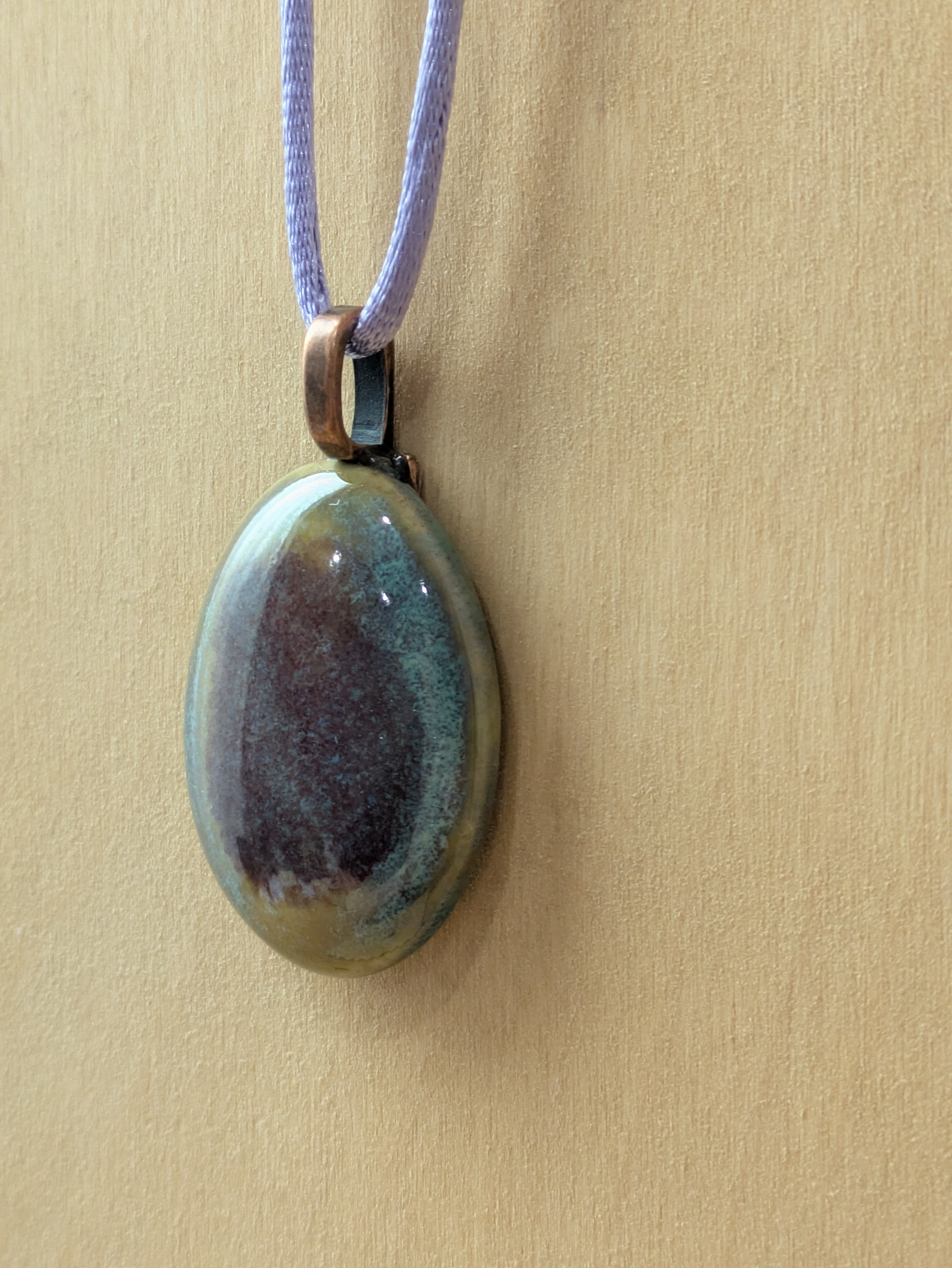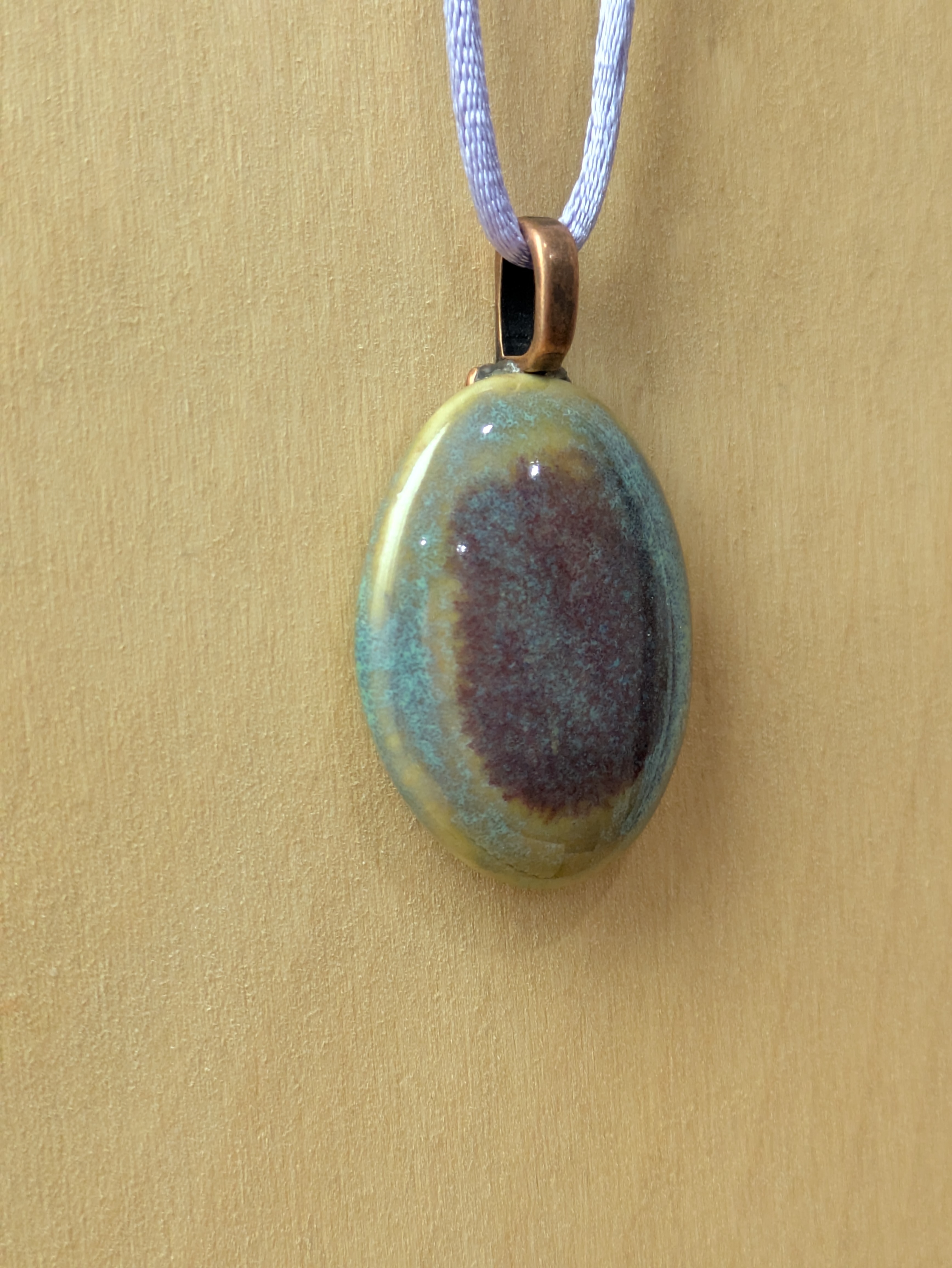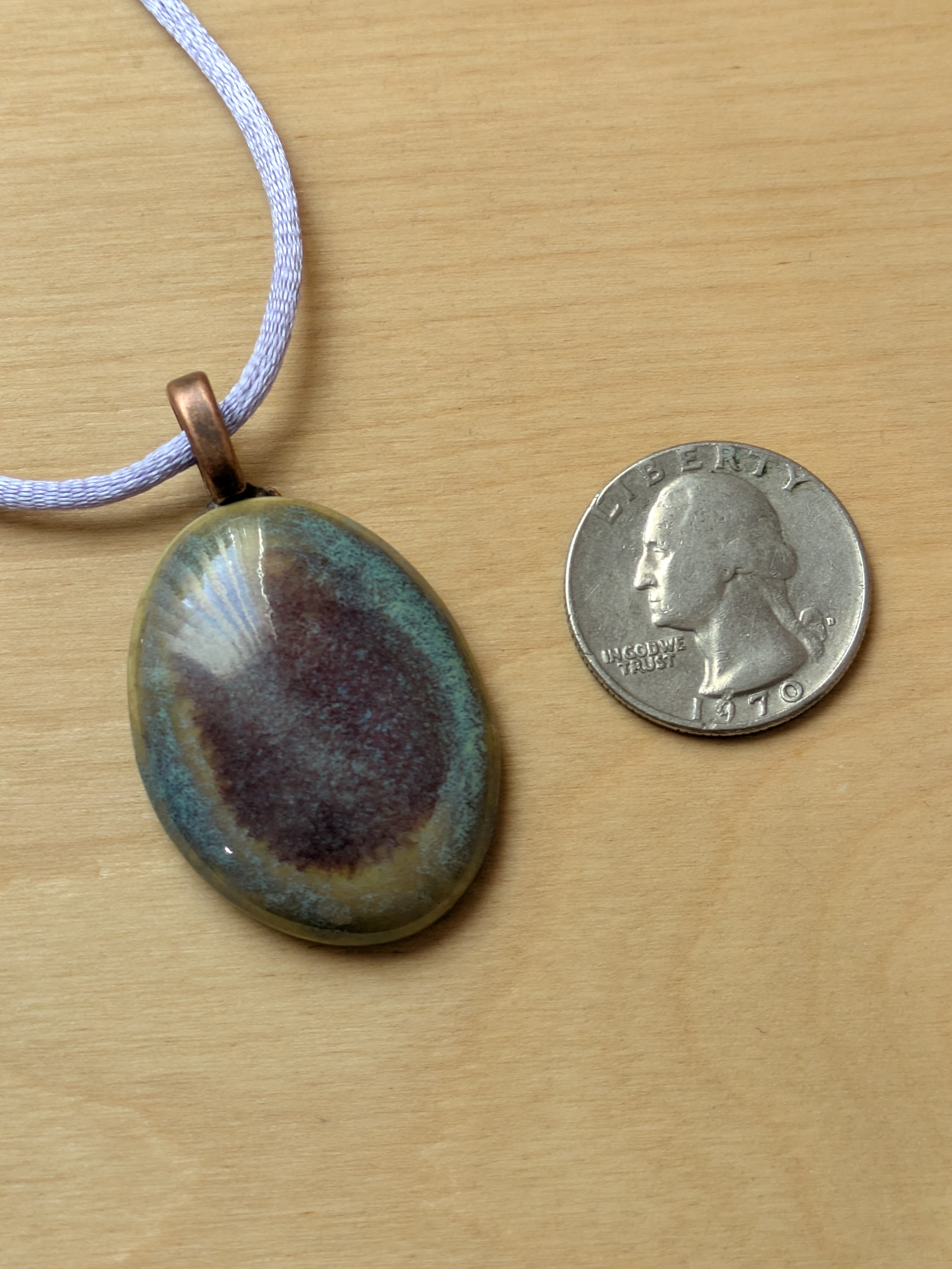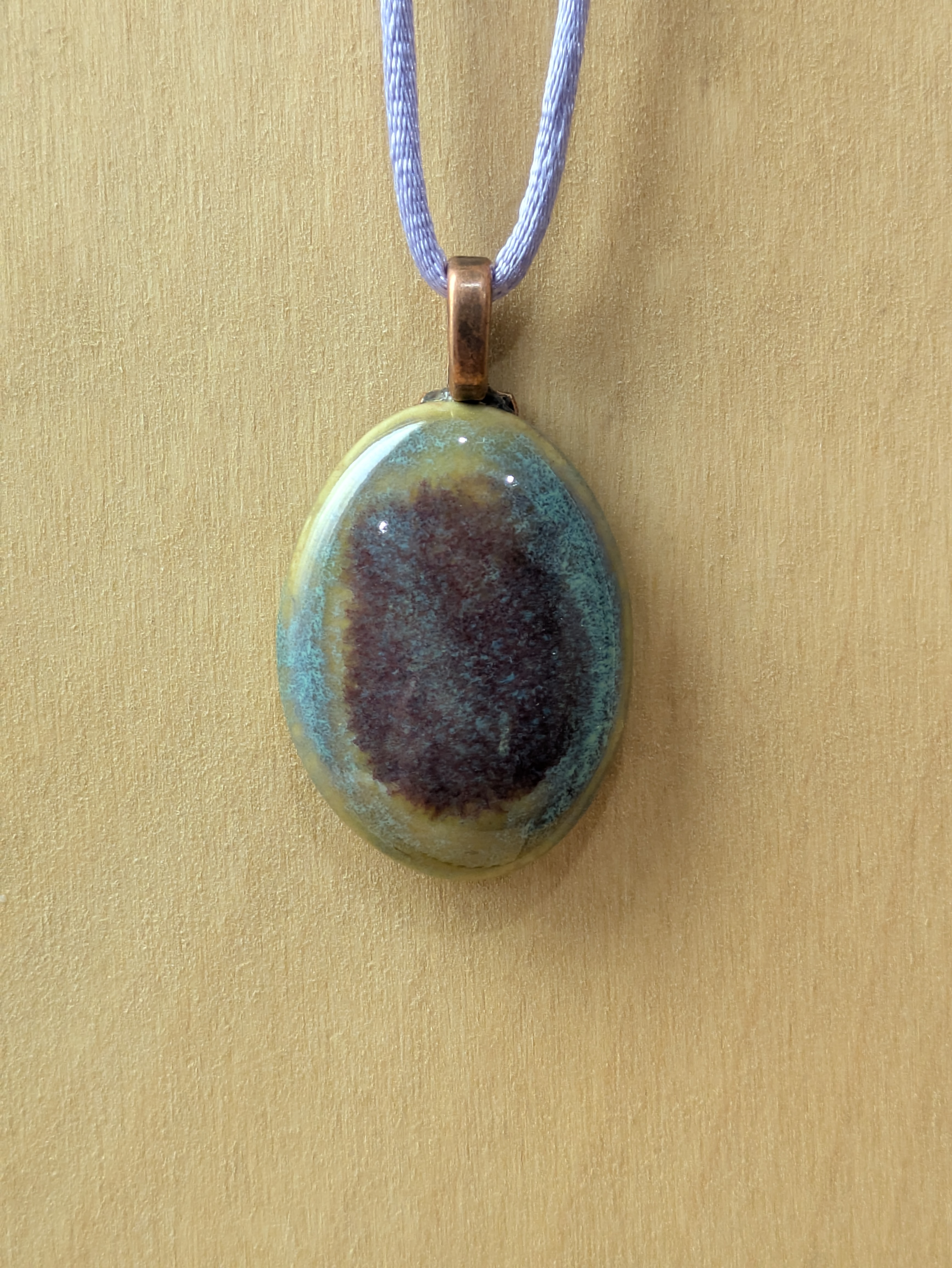 Oval Cabochon Shape ceramic pendant necklace that I made by hand using white stoneware clay. I used food safe glazes to achieve the stunning, unique glaze result you see in the pictures. 20" lilac colored satin adjustable cord with lobster claw clasp. Pendant is 1.25" long x 1.0" wide. (See the picture with a quarter for scaling). The edges and backside have also been glazed - see the last picture of the pendant which shows the backside and the 3 "stilt" marks that result from choosing to glaze all surfaces - the pendant must be elevated off the kiln shelf using high-temperature wire and a support or else the pendant would fuse to the shelf during the firing.